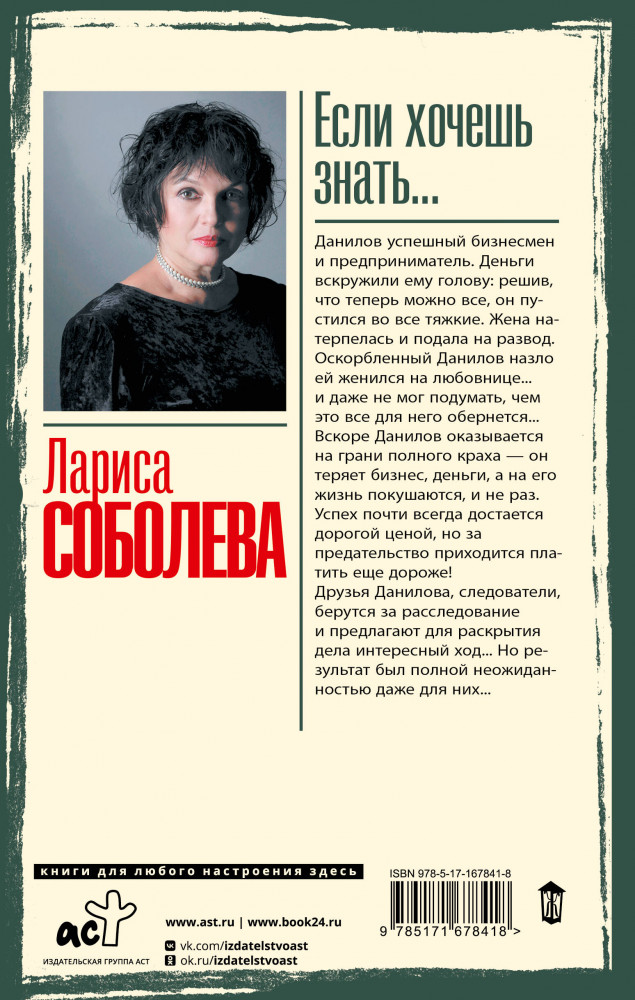 | Лариса Павловна Соболева - автор популярных авантюрных детективов. Лариса - уникальная личность. В прошлом актриса, в будущем талантливый сценарист. |