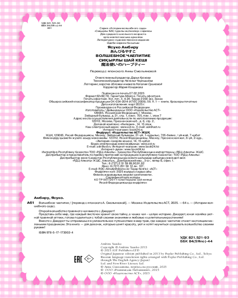 💳 Оплатить за товар можно при получении 🇰🇿 Есть бесплатная доставка по Казахстану от 1 дня 🎁 Копите бонусы с каждой покупки Серия: Истории волшебного сада Открой волшебство травяного чая вместе с джаррет! Представь себе мир, где каждый листочек хранит свою тайну, а чашка чая — целую историю. Джаррет, юная хозяйка уютной травяной аптеки, готова поделиться с тобой своими знаниями и любовью к целительным растениям! Вместе с джаррет ты отправишься в увлекательное путешествие в мир трав, где каждое чаепитие станет настоящим маленьким праздником. Эта книга — для девочек, которые ценят красоту, уют и хотят научиться создавать волшебство своими руками! |