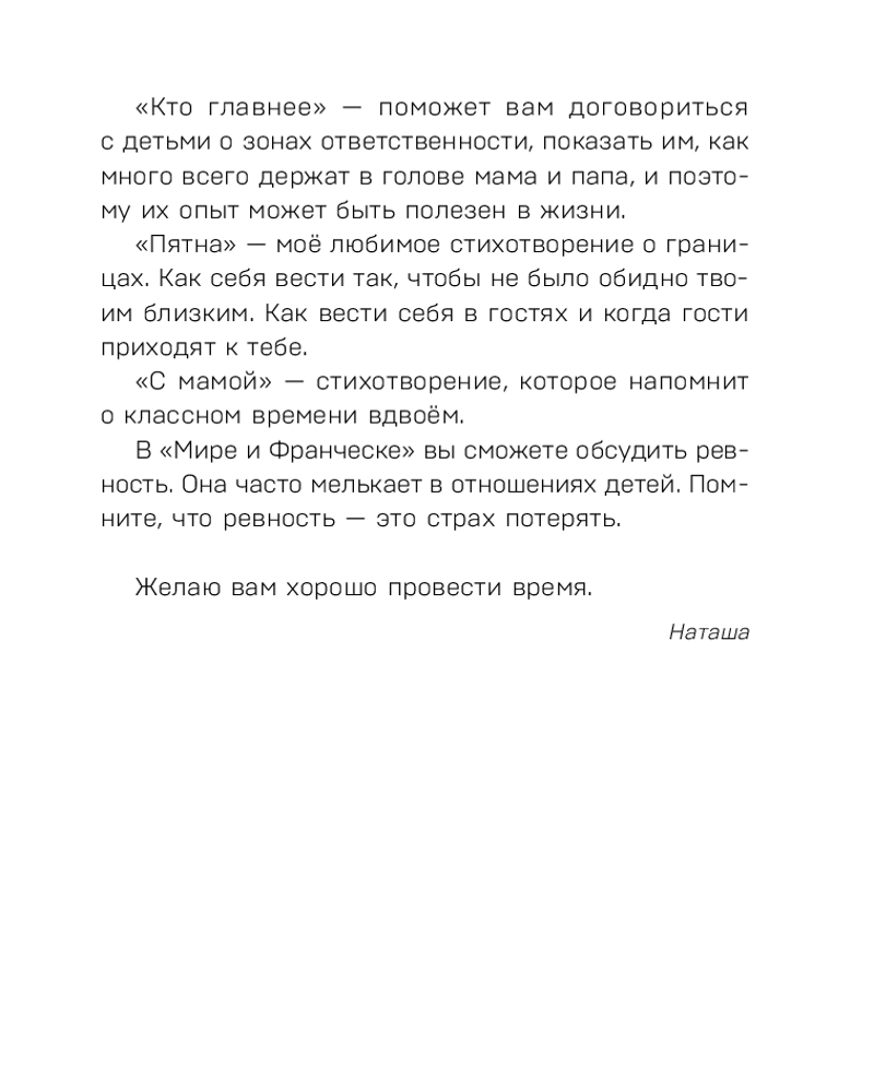 💳 Оплатить за товар можно при получении 🇰🇿 Есть бесплатная доставка по Казахстану от 1 дня 🎁 Копите бонусы с каждой покупки Серия: Детям о важном Стихи, однажды написанные Натальей Ремиш для своей дочери, стали сценарием к мультику «Просто о важном. Про Миру и Гошу», который собрал миллионы просмотров в Сети. Темы, волновавшие одну маму, оказались важными для многих родителей. Это продолжение известных стихов «Детям о важном» от писательницы, продюсера, журналиста, социального предпринимателя и автора полумиллионного блога. На этот раз речь пойдет об эмоциях и актуальных темах для родителей и ребенка от 3 до 8 лет. Это не просто детские стихи, а возможность провести время вместе с ребенком, обратить внимание на важные темы и проговорить разные ситуации. Наталья Ремиш поможет донести до ребенка непростые, но очень нужные правила. |
