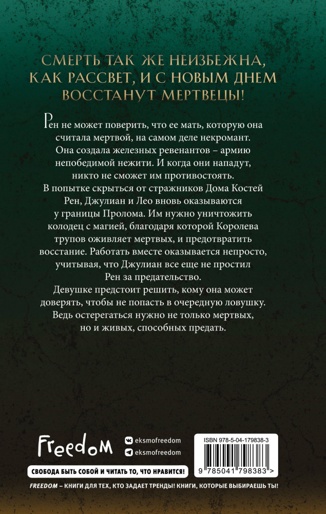 💳 Оплатить за товар можно при получении 🇰🇿 Есть бесплатная доставка по Казахстану от 1 дня 🎁 Копите бонусы с каждой покупки Серия: Young Adult. Заклинательница мертвых Рен не может поверить, что ее мать, которую она считала мертвой, на самом деле некромант. Она создала железных ревенантов — армию непобедимой нежити. И когда они нападут, никто не сможет им противостоять. В попытке скрыться от стражников Дома Костей Рен, Джулиан и Лео вновь оказываются у границы Пролома. Им нужно уничтожить колодец с магией, благодаря которой Королева трупов оживляет мертвых, и предотвратить восстание. Работать вместе оказывается непросто, учитывая, что Джулиан все еще не простил Рен за предательство. Девушке предстоит решить, кому она может доверять, чтобы не попасть в очередную ловушку. Ведь остерегаться нужно не только мертвых, но и живых, способных предать. Захватывающее продолжение, которое с первых страниц погружает вас в детально продуманный мир и не отпускает до последней страницы. Иллюстрацию на обложку рисовала Kliory Draw |