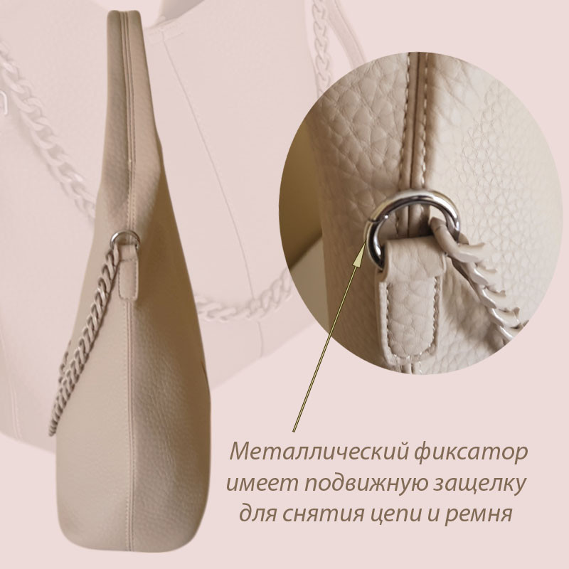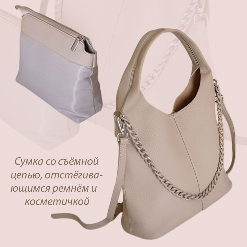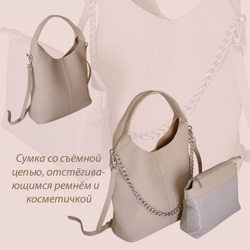 Этот комплект состоит из двух элементов: вместительной сумки и стильной косметички. Легкость набора делает его практичным и удобным в повседневном использовании. Высокое качество исполнения — ровные строчки, аккуратная фурнитура и декоративные детали — подчеркивают его изысканность. Базовая сумка закрывается на кнопку-магнит, а ее лаконичный дизайн дополнен элегантным вертикальным швом по центру. По желанию можно украсить модель съемной декоративной цепью. Клатч-косметичка выполнена из комбинации текстиля и искусственной кожи, внутри предусмотрены два кармана: один на молнии и один открытый. В комплект входит регулируемый плечевой ремень, позволяющий носить сумку на плече или через плечо. Минималистичный, но не скучный дизайн и нарядный светло-бежевый цвет делают аксессуар идеальным дополнением к любому гардеробу, особенно в весенне-летний сезон!