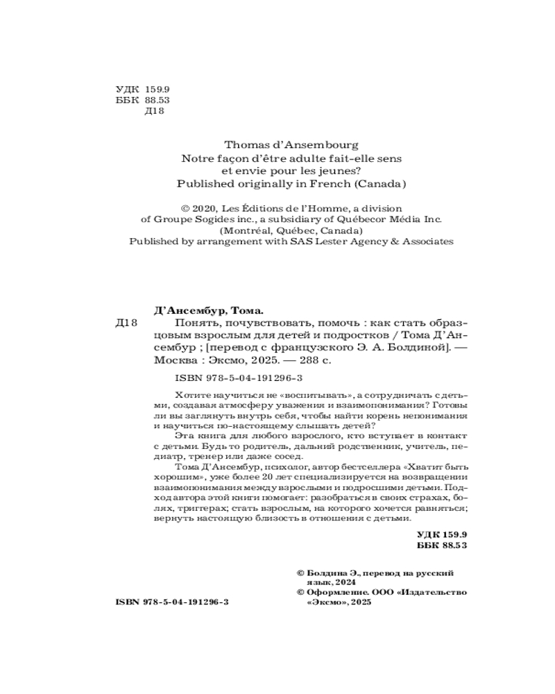 💳 Оплатить за товар можно при получении 🇰🇿 Есть бесплатная доставка по Казахстану от 1 дня 🎁 Копите бонусы с каждой покупки Серия: Психология общения. Новое оформление Вы когда-нибудь чувствовали, что говорите с ребенком на разных языках, как будто между вами непреодолимая стена? Хотите научиться не «воспитывать», а сотрудничать с детьми, создавая атмосферу уважения и взаимопонимания? Готовы ли вы заглянуть внутрь себя, чтобы найти корень непонимания и научиться по-настоящему слышать детей? Эта книга для любого взрослого, кто вступает в контакт с детьми. Будь то родитель, дальний родственник, учитель, педиатр, тренер или даже сосед. Для тех, кто подустал от постоянных сражений или очень боится, что они вот-вот начнутся. Тома Д’Ансембур, психолог, автор бестселлера «Хватит быть хорошим», уже более 20 лет специализируется на возвращении взаимопонимания между взрослыми и подросшими детьми. Он утверждает, что корень проблемы часто кроется в отношении взрослых к самим себе и в отсутствии опыта взаимопонимания со своими собственными родителями. |