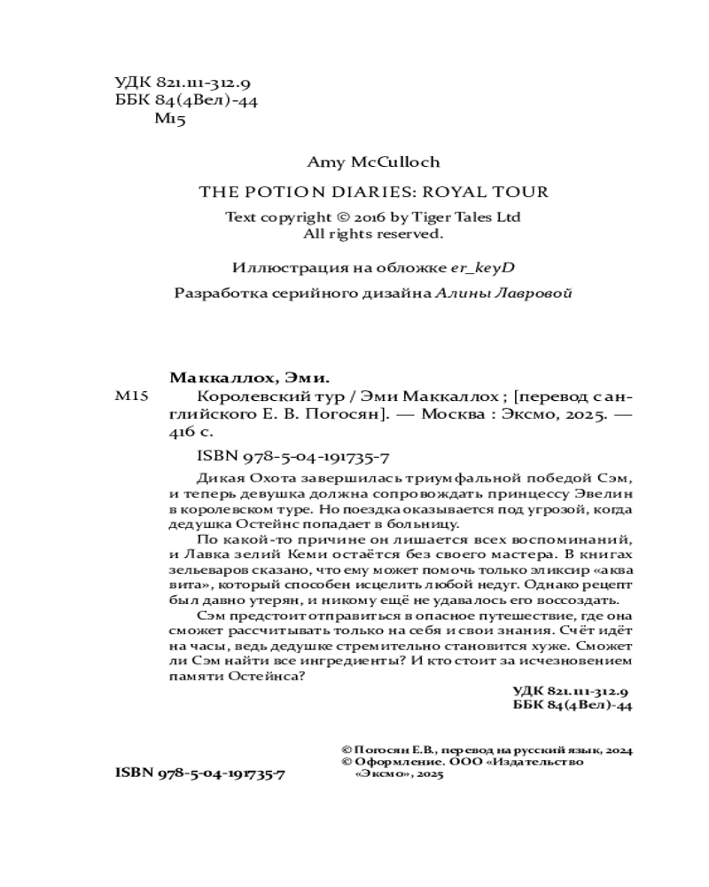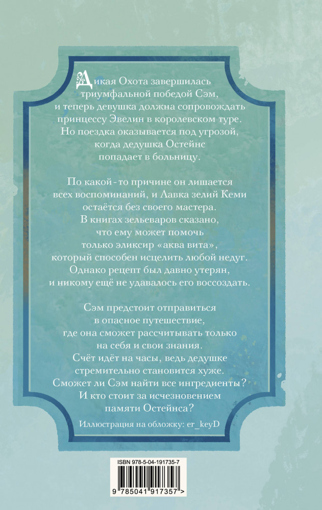 💳 Оплатить за товар можно при получении 🇰🇿 Есть бесплатная доставка по Казахстану от 1 дня 🎁 Копите бонусы с каждой покупки Серия: Книга зелий После спасения принцессы Сэм Кеми становится всенародной героиней. Она даёт одно интервью за другим и собирается в королевский тур, а в семейной лавке зелий нет отбоя от клиентов. Но счастье новоиспечённого зельевара длилось недолго, ведь её любимый дедушка внезапно теряет память. Единственный способ ему помочь — приготовить эликсир «аква вита», который, согласно легенде, может излечить любой недуг. Однако ещё ни одному человеку не удалось воссоздать давно утраченный рецепт. Сэм должна совершить невозможное, чтобы спасти не только своего дедушку, но и всё королевство, ведь она не единственная, кто охотится за эликсиром жизни... |