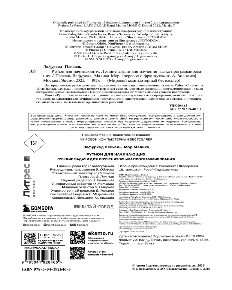 💳 Оплатить за товар можно при получении 🇰🇿 Есть бесплатная доставка по Казахстану от 1 дня 🎁 Копите бонусы с каждой покупки Серия: Мировой компьютерный бестселлер Python для начинающих. Лучшие задачи для изучения языка программирования. Поиск интересных решений для нескучных кейсов позволит легко начать программировать на Python и освоить ключевые понятия информатики в игровой форме. Эти головоломки требуют логического мышления, внимательности и иногда немного смекалки, но все они доступны для понимания даже ученикам средней школы. Каждое решение сопровождается подробными объяснениями, а также основными командами на Python 3 и алгоритмами действий. Играя и размышляя, вы будете развивать креативность и навыки программирования. Это не просто книга, а источник вдохновения для всех, кто готов программировать и зарабатывать этим деньги. |