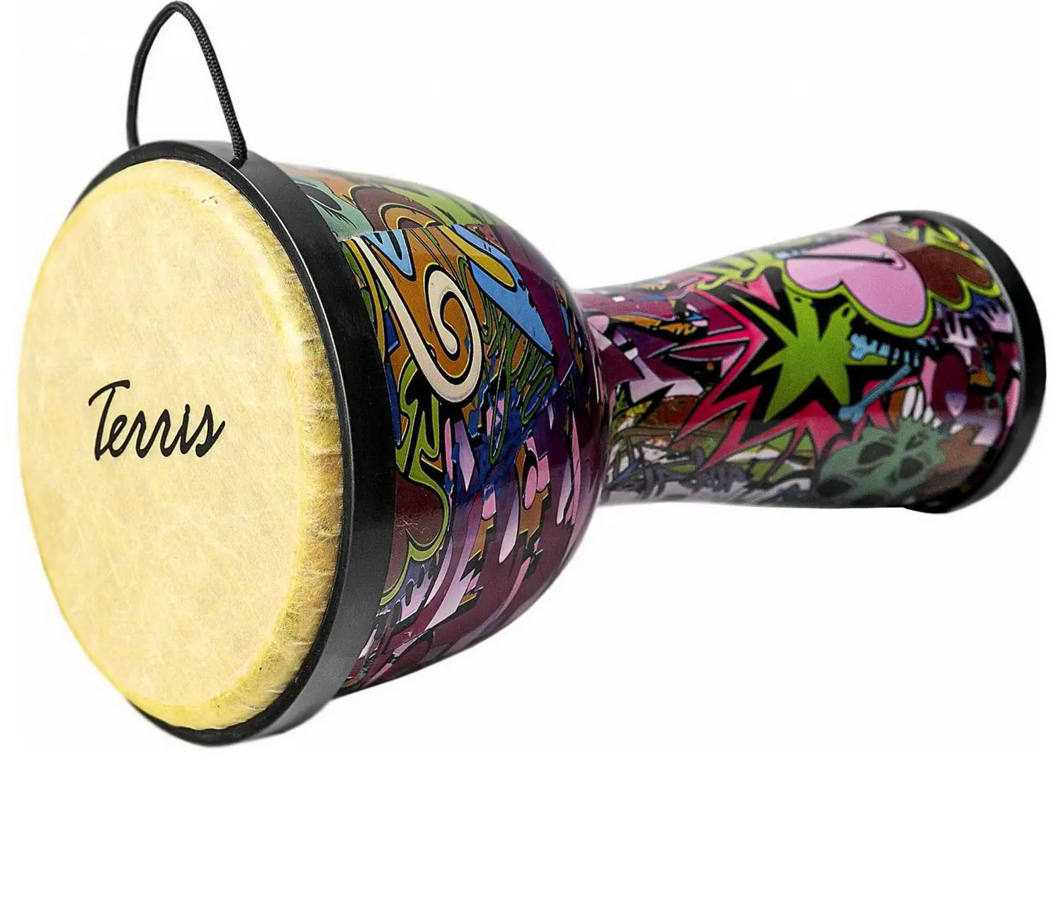 Terris DPС-08 hop — Джембе размера 08″ × 16″ из пластика с синтетической мембраной и ярким дизайном, навеянным Hip-Hop культурой. Пластиковый корпус делает барабан невероятно легким, что в разы увеличивает мобильность инструмента. Теперь Вы всегда сможете взять Ваш джембе в путешествие! Кроме того, пластик позволяет использовать барабан на улице: непогода больше не сможет испортить Ваши планы. Все это, в сочетании с демократичной ценой, делает джембе Terris идеальным походным вариантом.