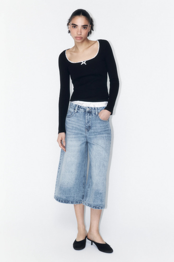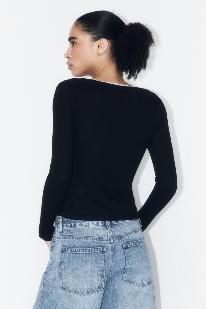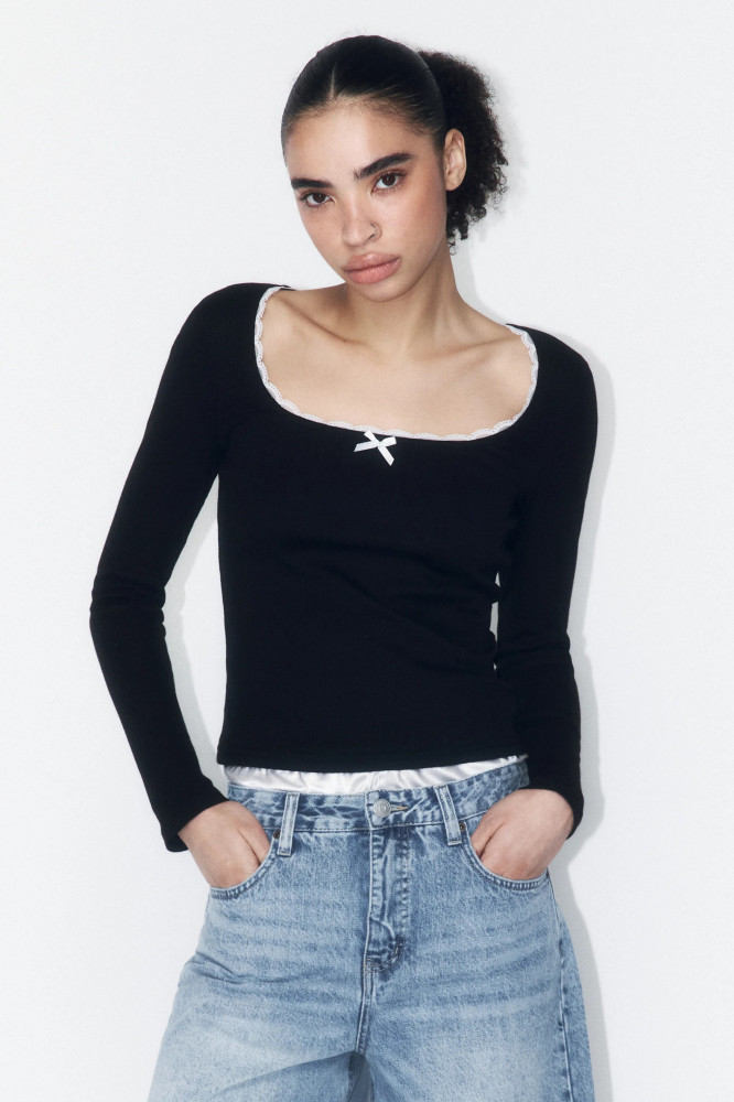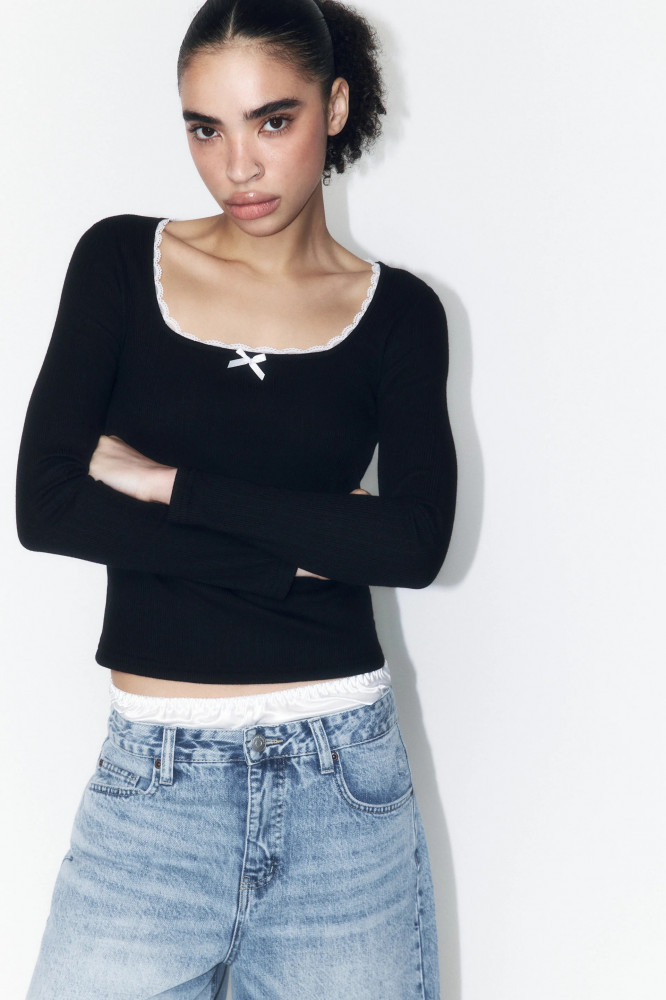 Короткий женский лонгслив приталенного кроя из мягкой, приятной к телу ткани с фактурой в рубчик. Глубокий вырез-каре на груди с отделкой из кружева и декоративным бантиком. Длинные облегающие рукава с прямыми манжетами и прямой линией плеча. Прямой нижний край без разрезов и декоративных элементов. Лонгслив с вырезом-каре для женственных, стильных и привлекательных аутфитов на учебу, в офис или просто на каждый день. Лонгслив из новой коллекции может сочетаться с брюками на высокой талии и создавать трендовый образ офисной сирены. А может добавить спокойствия и классики образам с карго или парашютами на низкой талии. Приталенная блузка с кружевом внесет приятное разнообразие в образы под любое настроение и любой сезон: носи ее отдельно или в составе трендовых многослойных образов.