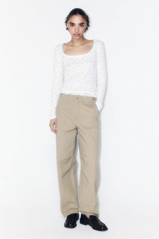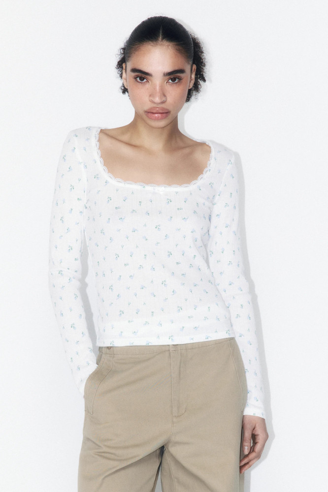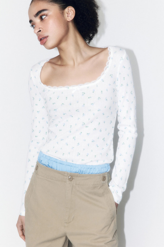 Короткий женский лонгслив приталенного кроя из мягкой, приятной к телу ткани с фактурой в рубчик. Глубокий вырез-каре на груди с отделкой из кружева и декоративным бантиком. Длинные облегающие рукава с прямыми манжетами и прямой линией плеча. Прямой нижний край без разрезов и декоративных элементов. Лонгслив с вырезом-каре для женственных, стильных и привлекательных аутфитов на учебу, в офис или просто на каждый день. Лонгслив из новой коллекции может сочетаться с брюками на высокой талии и создавать трендовый образ офисной сирены. А может добавить спокойствия и классики образам с карго или парашютами на низкой талии. Приталенная блузка с кружевом внесет приятное разнообразие в образы под любое настроение и любой сезон: носи ее отдельно или в составе трендовых многослойных образов.