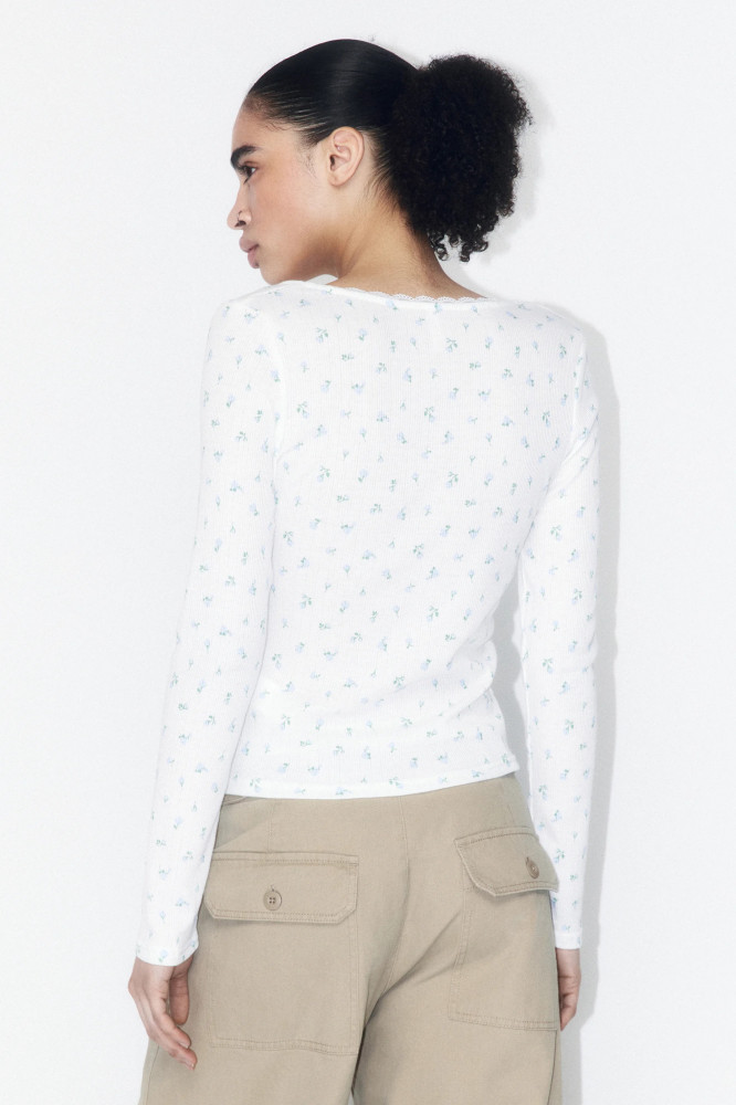 Короткий женский лонгслив приталенного кроя из мягкой, приятной к телу ткани с фактурой в рубчик. Глубокий вырез-каре на груди с отделкой из кружева и декоративным бантиком. Длинные облегающие рукава с прямыми манжетами и прямой линией плеча. Прямой нижний край без разрезов и декоративных элементов. Лонгслив с вырезом-каре для женственных, стильных и привлекательных аутфитов на учебу, в офис или просто на каждый день. Лонгслив из новой коллекции может сочетаться с брюками на высокой талии и создавать трендовый образ офисной сирены. А может добавить спокойствия и классики образам с карго или парашютами на низкой талии. Приталенная блузка с кружевом внесет приятное разнообразие в образы под любое настроение и любой сезон: носи ее отдельно или в составе трендовых многослойных образов.