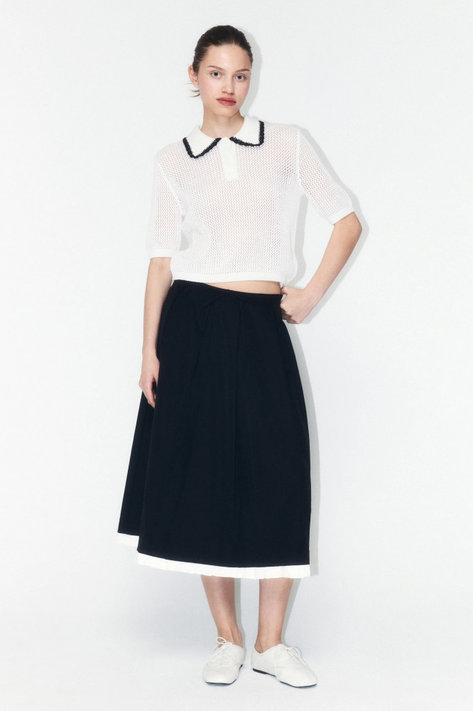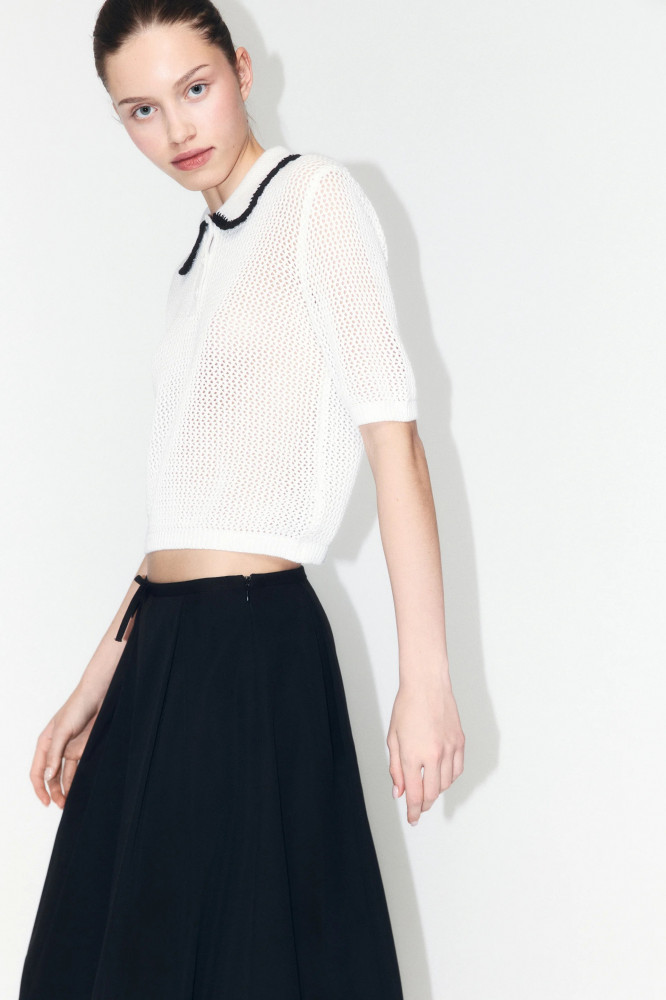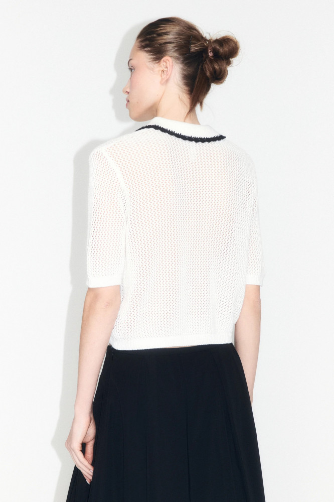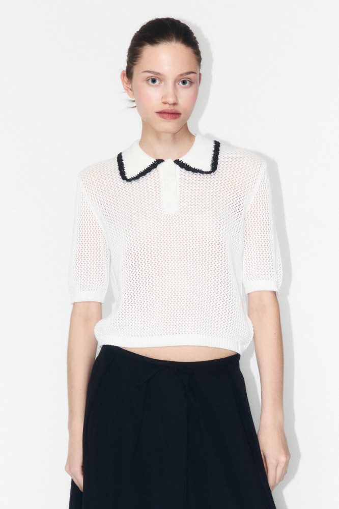 Короткий женский джемпер-поло полуприлегающего кроя из полупрозрачной ажурной ткани на основе хлопка. Отложной рубашечный воротник с контрастными оборками, V-образный вырез на пуговицах. Короткие рукава с прямыми манжетами в рубчик и прямой линией плеча. Прямой нижний край в рубчик без разрезов и декоративных элементов. Соблазнительный полупрозрачный джемпер позволит создать образы в самых разных стилях. Сочетай его с классическим, повседневным, y2k или гранж-низом и создавай яркие, женственные и привлекательные аутфиты, в которых ты точно не останешься незамеченной. Ажурный вязаный джемпер-поло отлично будет сочетаться с вещами из кожи или денима. Отличный вариант основы аутфитов на прогулки, вечеринки, концерты и просто на каждый день. Носи его отдельно или в составе многослойных образов в зависимости от твоего настроения