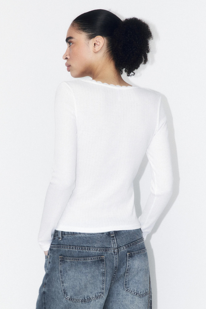 Короткий женский лонгслив приталенного кроя из мягкой, приятной к телу ткани с фактурой в рубчик. Глубокий вырез-каре на груди с отделкой из кружева и декоративным бантиком. Длинные облегающие рукава с прямыми манжетами и прямой линией плеча. Прямой нижний край без разрезов и декоративных элементов. Лонгслив с вырезом-каре для женственных, стильных и привлекательных аутфитов на учебу, в офис или просто на каждый день. Лонгслив из новой коллекции может сочетаться с брюками на высокой талии и создавать трендовый образ офисной сирены. А может добавить спокойствия и классики образам с карго или парашютами на низкой талии. Приталенная блузка с кружевом внесет приятное разнообразие в образы под любое настроение и любой сезон: носи ее отдельно или в составе трендовых многослойных образов.