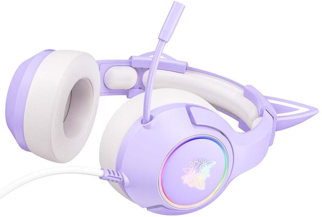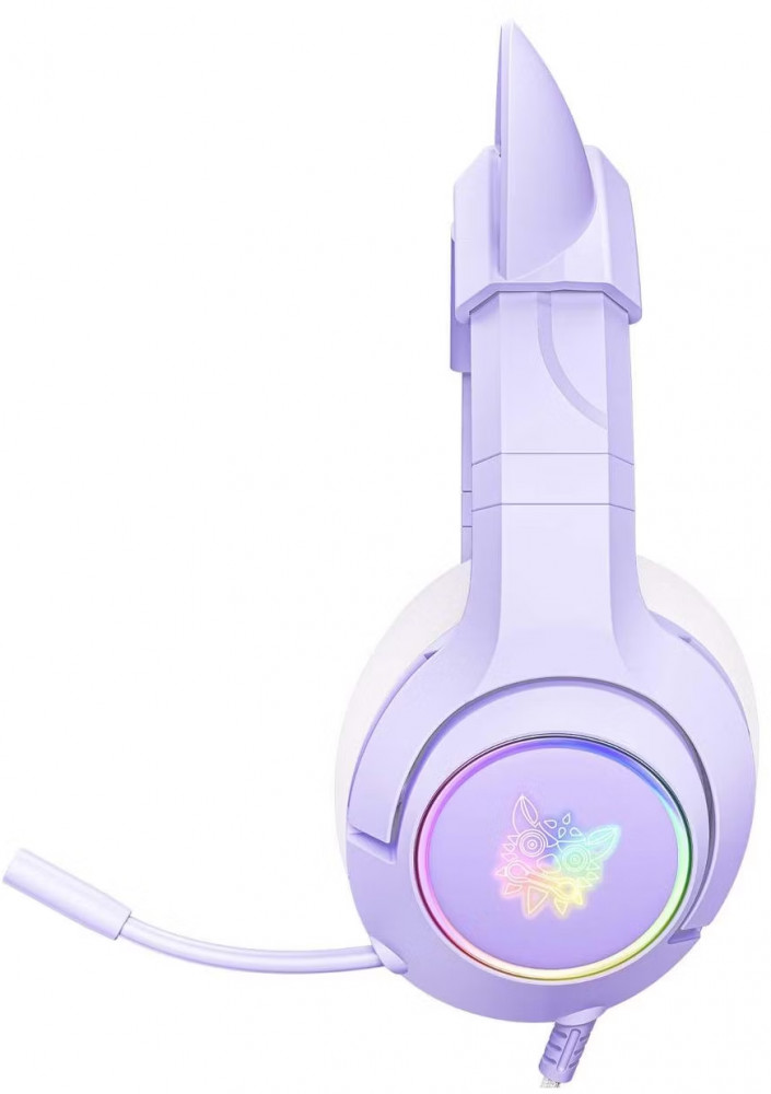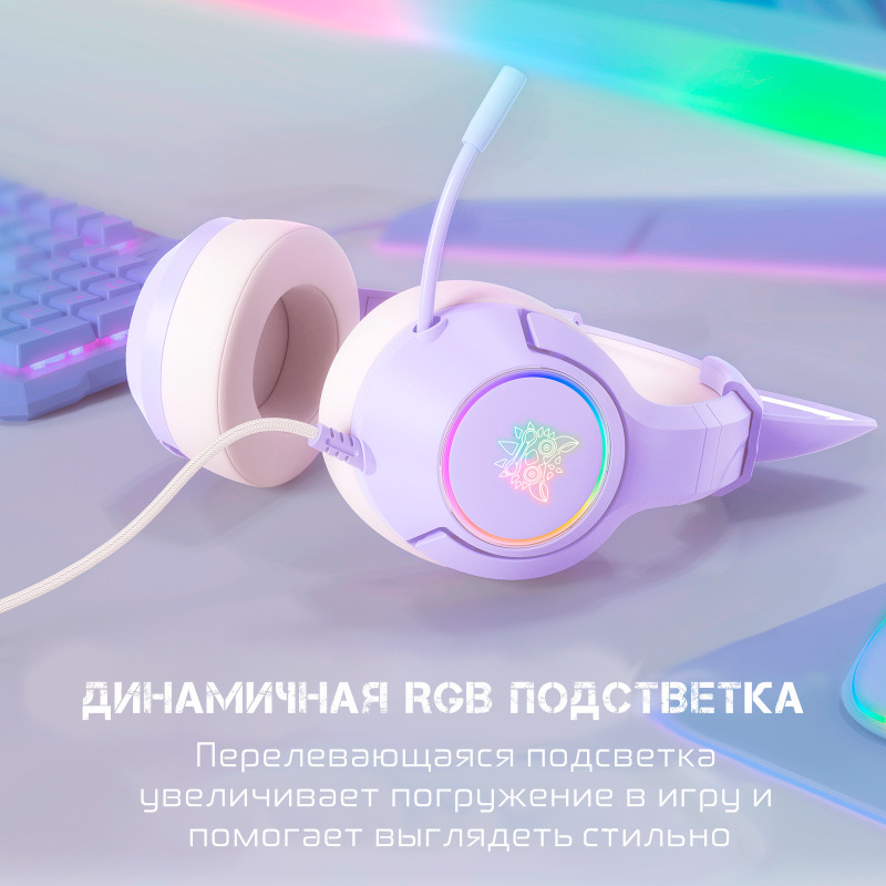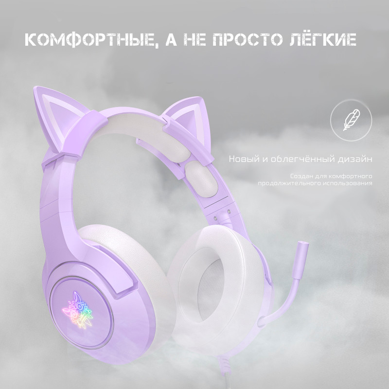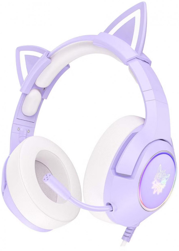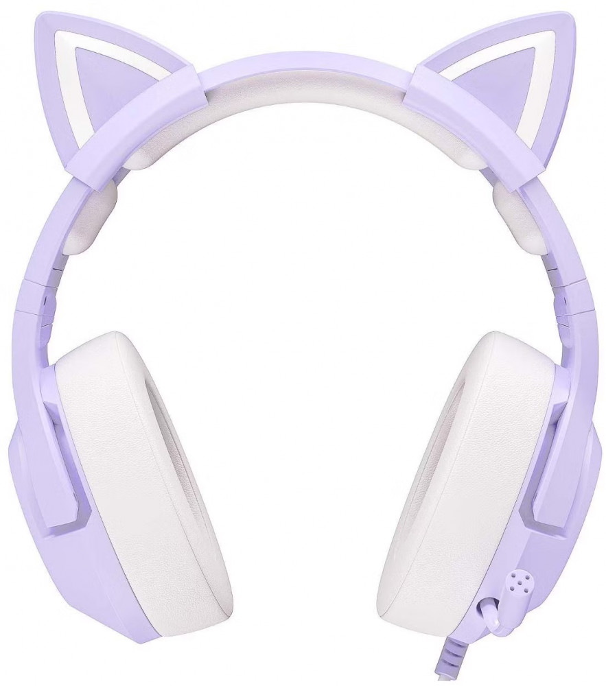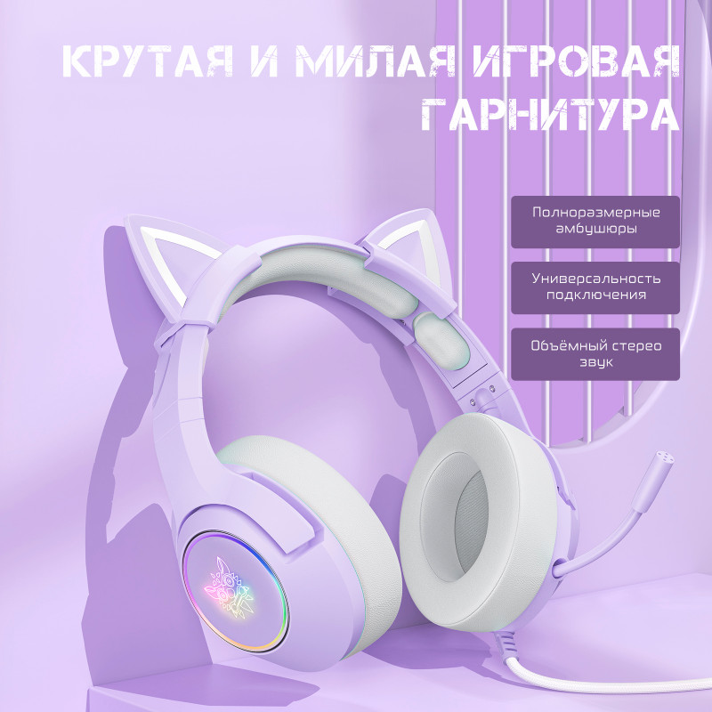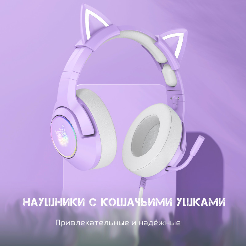 В комплект к наушникам идут съёмные силиконовые ушки, которые будут мило смотреться как на девушке, так и на парне. Наушники с ушками Onikuma Cat выполнены в фиолетовом цвете. Другая отличительная особенность — наличие яркой RGB-подсветки, которая автоматически включается при подключении игровых наушников к вашему гаджету через USB-штекер. Наушники с подсветкой — это привлекательный атрибут и отличный подарок для геймера.