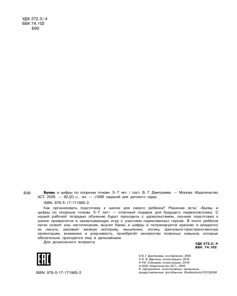 💳 Оплатить за товар можно при получении 🇰🇿 Есть бесплатная доставка по Казахстану от 1 дня 🎁 Копите бонусы с каждой покупки Серия: 1000 заданий для детского сада Как организовать подготовку к школе для своего ребёнка? Решение есть! «Буквы и цифры по опорным точкам. 5-7 лет» — отличный подарок для будущего первоклассника. С нашей рабочей тетрадью обучение будет проходить с удовольствием, скучная подготовка к школе превратится в захватывающую игру с участием нарисованных героев. В итоге ребёнок легко освоит азы чистописания, выучит буквы и цифры и потренируется красиво и аккуратно их писать, разовьёт мелкую моторику, мышление, логику, зрительно-пространственную ориентацию, внимание и усидчивость, приобретёт множество полезных навыков, которые обязательно пригодятся ему в дальнейшем. Для дошкольного возраста. |