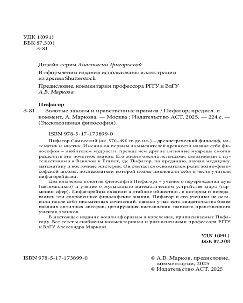 💳 Оплатить за товар можно при получении 🇰🇿 Есть бесплатная доставка по Казахстану от 1 дня 🎁 Копите бонусы с каждой покупки Серия: Эксклюзивная философия Пифагор Самосский (ок. 570 — ок. 490 до н.э.) — древнегреческий философ, математик, создатель религиозно-философской школы пифагорейцев. Он проповедовал метемпсихоз (учение о переселении душ), вегетарианство и гармонию сфер. Учение Пифагора стало основой для открытий в области математики, астрологии и теории музыки. Он был учеником Ферекида, Фалеса, Анаксимандра и Анаксимена. В книге «Золотые законы и нравственные страдания» современный философ Александр Марков реконструирует жизнь и научные достижения древнегреческого философа Пифагора. Интересные комментарии дополнят картину, а занимательные иллюстрации облегчат восприятие книги. |