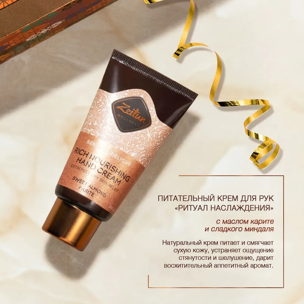 Крем для рук «Sense of delight»: Aqua, Cetearyl Alcohol, Cocos Nucifera (Coconut) Oil, Glycine Soja (Soybean) Oil, Glyceryl Stearate, Glycerin, Panthenol, Butyrospermum Parkii (Shea) Butter, Inulin, Mangifera Indica (Mango) Seed Butter, Prunus Amygdalus Dulcis (Sweet Almond) Oil, Hippophae Rhamnoides (Sea Buckthorn) Fruit Oil, Hydrogenated Olive Oil Unsaponifiables, Olea Europaea (Olive) Oil Unsaponifiables, Tocopheryl Acetate, Tocopherol, Beta-sitosterol, Squalene, Tetrasodium Glutamate Diacetate, Sodium Lauroyl Glutamate, Sodium Stearoyl Lactylate, Potassium Cetyl Phosphate, Glyceryl Rosinate, Propylheptyl Caprylate, Hydrogenated Ethylhexyl Olivate, Xanthan Gum, Prunus Amygdalus Amara (Bitter Almond) Kernel Oil, Ethylhexylglycerin, Phenoxyethanol, Parfum, Limonene, Linalool, Coumarin, Alpha-Isomethyl Ionone.
