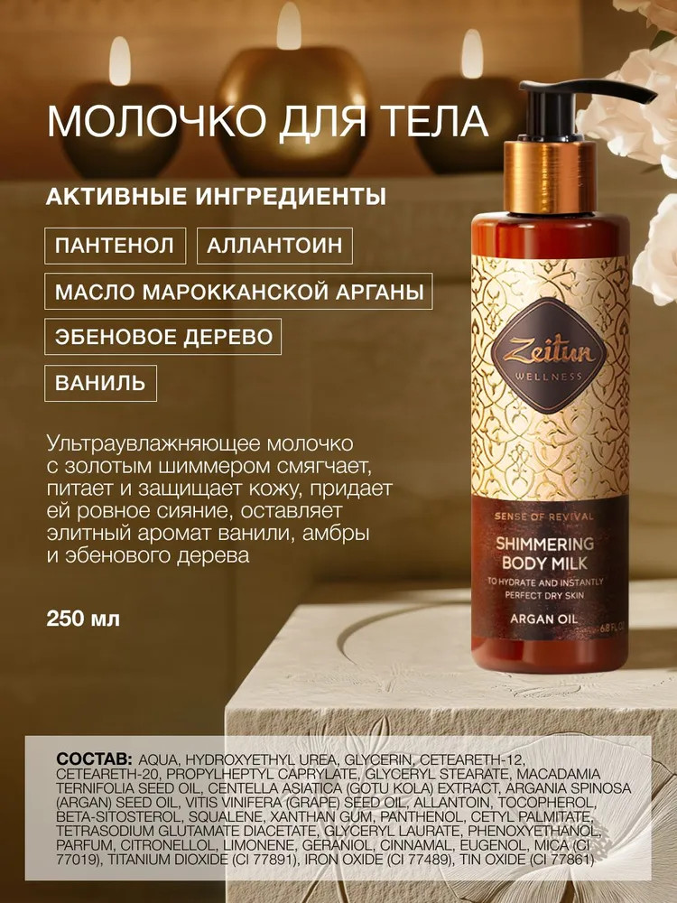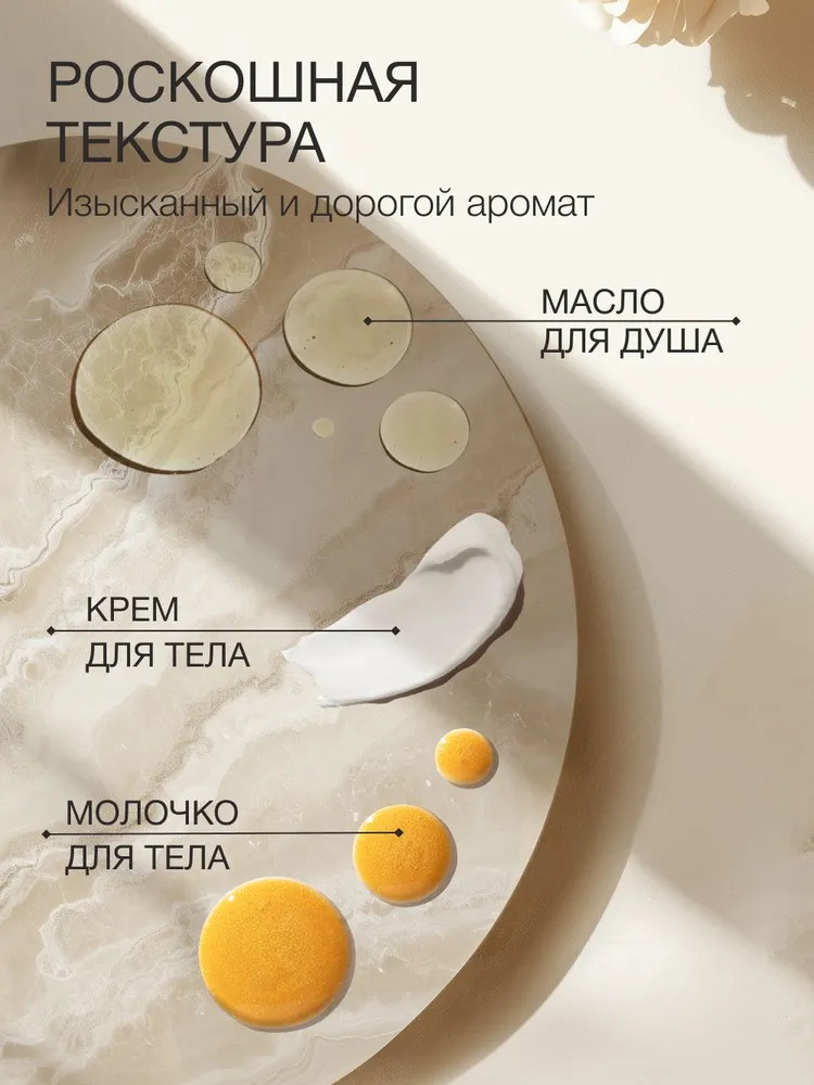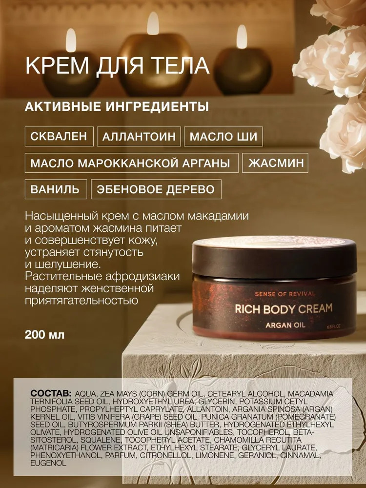 Крем для тела: Aqua, Zea Mays (Corn) Germ Oil, Cetearyl Alcohol, Macadamia Ternifolia Seed Oil, Hydroxyethyl Urea, Glycerin, Potassium Cetyl Phosphate, Propylheptyl Caprylate, Allantoin, Argania Spinosa (Argan) Kernel Oil, Vitis Vinifera (Grape) Seed Oil, Punica Granatum (Pomegranate) Seed Oil, Butyrospermum Parkii (Shea) Butter, Hydrogenated Ethylhexyl Olivate, Hydrogenated Olive Oil Unsaponifiables, Tocopherol, Beta-Sitosterol, Squalene, Tocopheryl Acetate, Chamomilla Recutita (Matricaria) Flower Extract, Ethylhexyl Stearate, Glyceryl Laurate, Phenoxyethanol, Parfum, Citronellol, Limonene, Geraniol, Cinnamal, Eugenol.