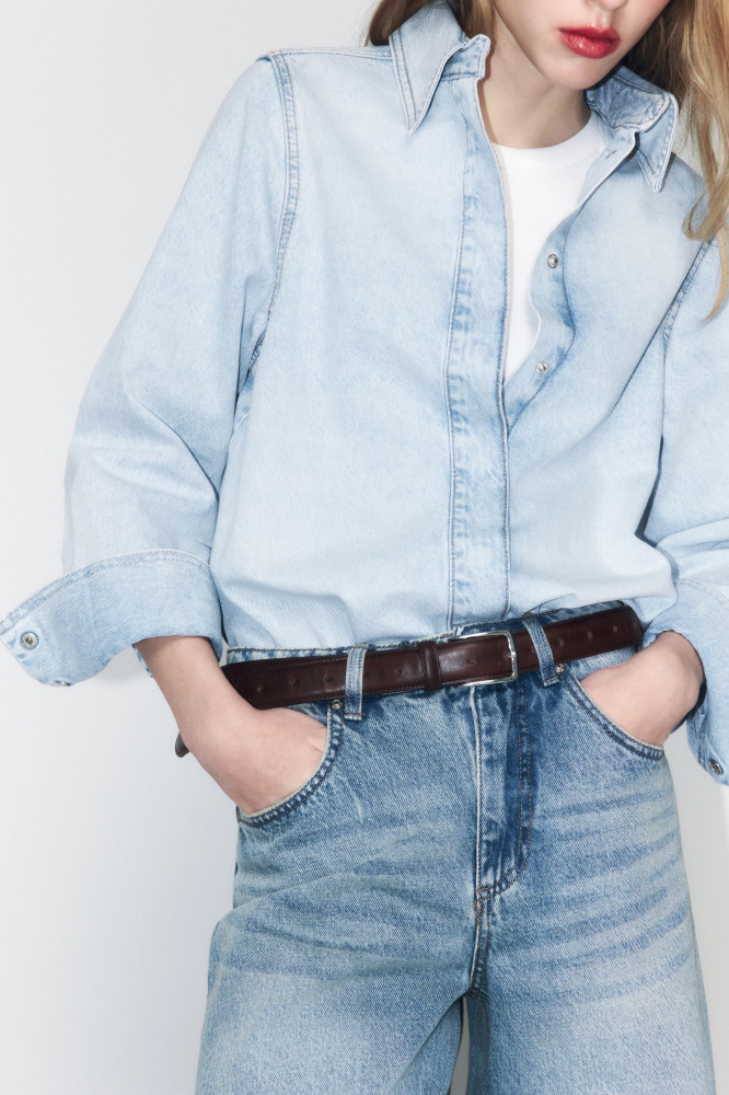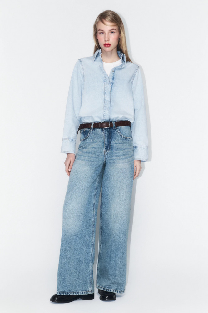 Женская джинсовая рубашка-овершот прямого кроя из плотного, приятного к телу 100% хлопкового денима. Классический отложной воротник с застежкой под горло. Длинные свободные рукава с широкими манжетами с застежкой на кнопки, прямая линия плеча. Застежка на кнопки по всей длине спереди. Закругленный нижний край. Джинсовая рубашка-овершот с вареным эффектом для создания комфортных образов на любой сезон. Стильная рубашка, которую можно носить как отдельно, так и в составе многослойных образов в повседневном или уличном стиле. Создавай расслабленные кэжуал-луки или трендовые тотальные деним-луки на каждый день. Идеальная верхняя сорочка из денима на лето и осень, которая спасет тебя от вечерней прохлады или неожиданного дождя и которую удобно всегда брать с собой. Используй ее в качестве верхней рубашки по дороге на учебу или в офис.