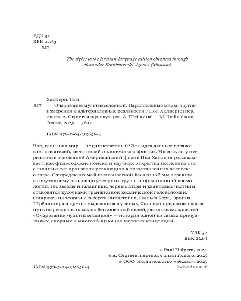 💳 Оплатить за товар можно при получении 🇰🇿 Есть бесплатная доставка по Казахстану от 1 дня 🎁 Копите бонусы с каждой покупки Что, если наш мир — не единственный? Эта идея давно завораживает писателей, мечтателей и кинематографистов. Но есть ли у нее реальные основания? Американский физик Пол Халперн рассказывает, как философские поиски и научные открытия последних ста с лишним лет произвели революцию в представлениях человека о мире. От предсказуемой ньютоновской Вселенной мы перешли к запутанному ландшафту теории струн и инфляционной космологии, где звезды и галактики, черные дыры и квантовые частицы становятся кусочками грандиозной космической головоломки. Опираясь на теории Альберта Эйнштейна, Нильса Бора, Эрвина Шрёдингера и других выдающихся ученых, Халперн предлагает взглянуть на реальность как на бесконечный калейдоскоп возможностей. «Очарование мультивселенной» — история одной из самых причудливых, спорных и многообещающих научных концепций. |