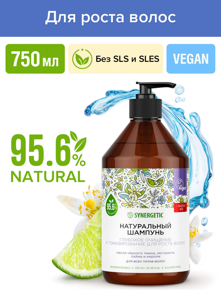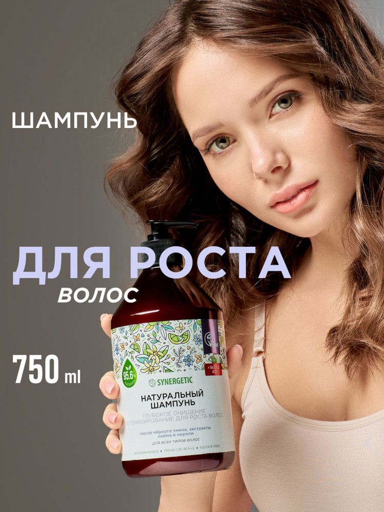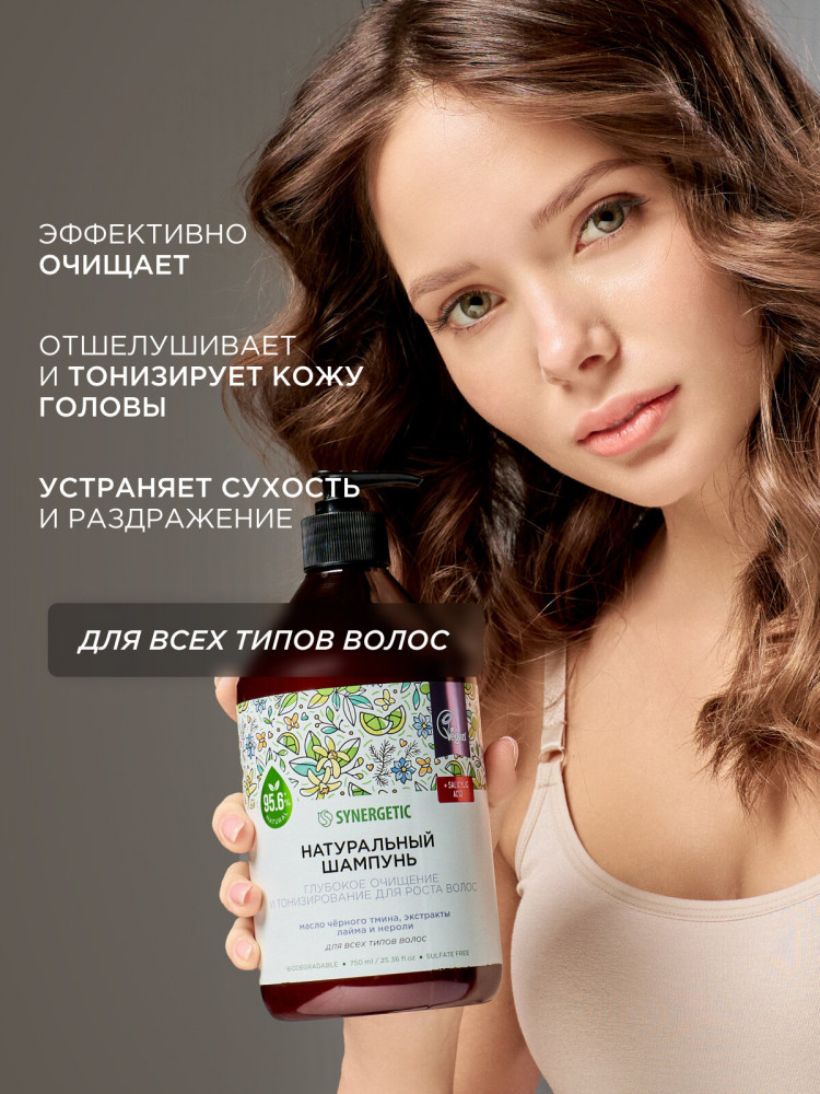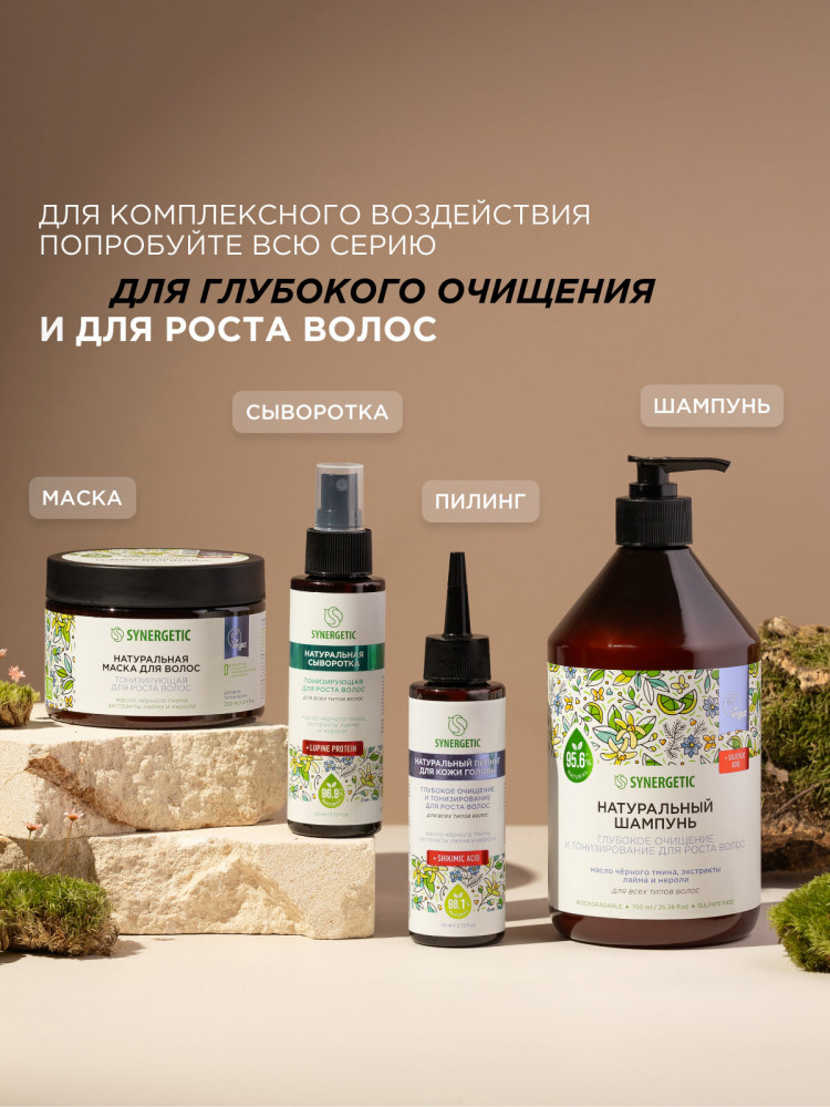 Synergetic Натуральный бессульфатный шампунь «Глубокое очищение и тонизирование для роста волос»