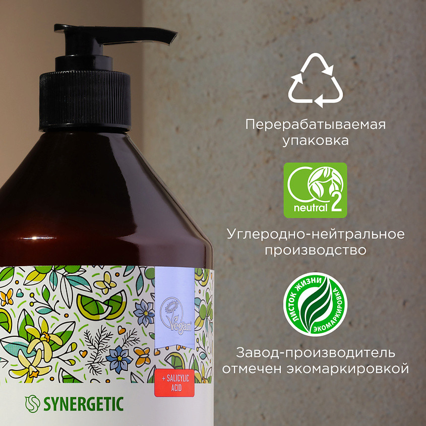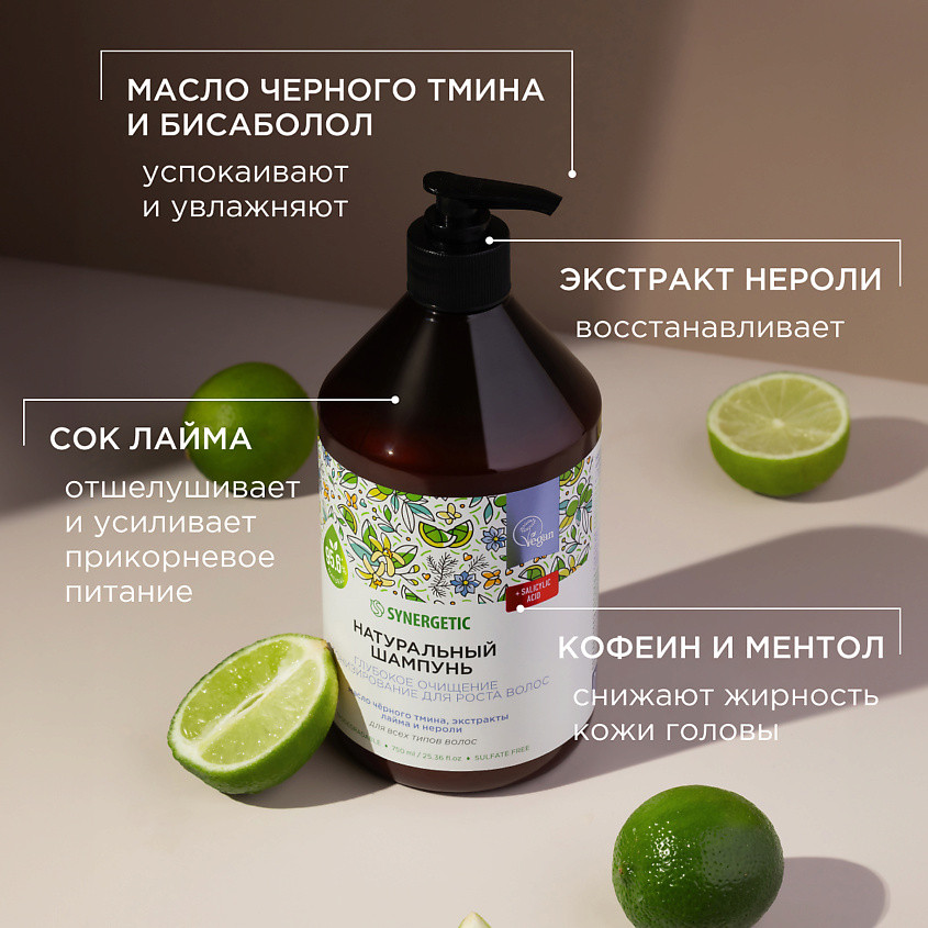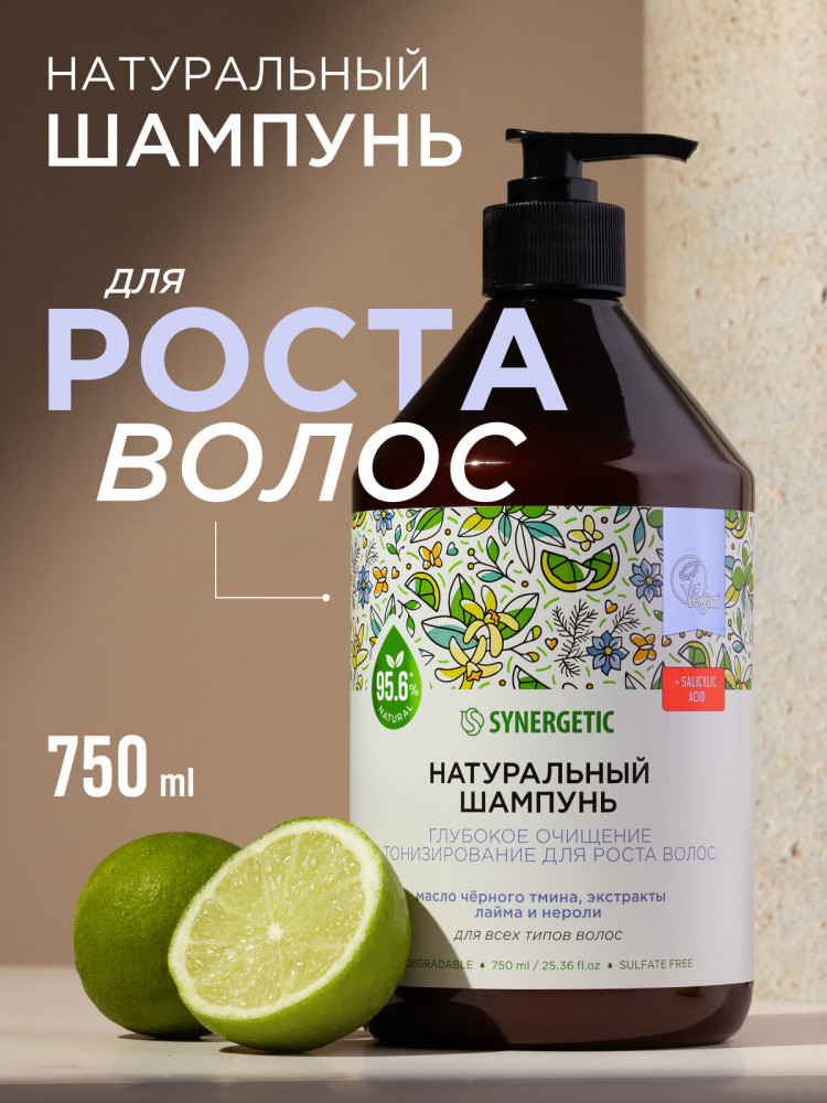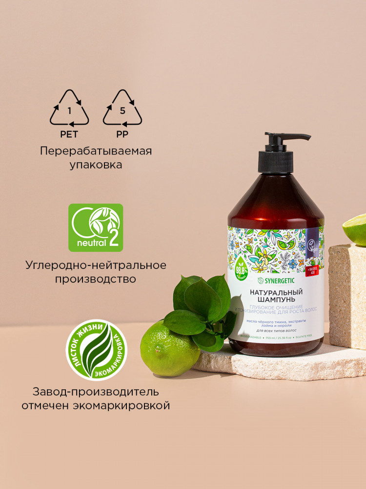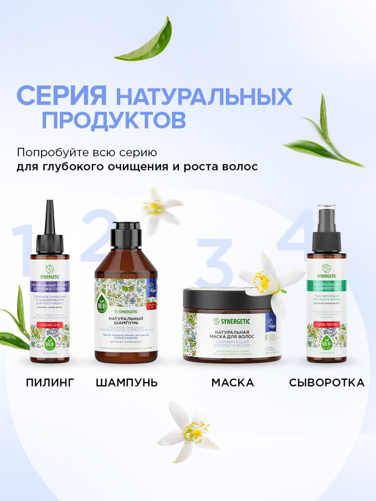 Synergetic Натуральный бессульфатный шампунь «Глубокое очищение и тонизирование для роста волос»