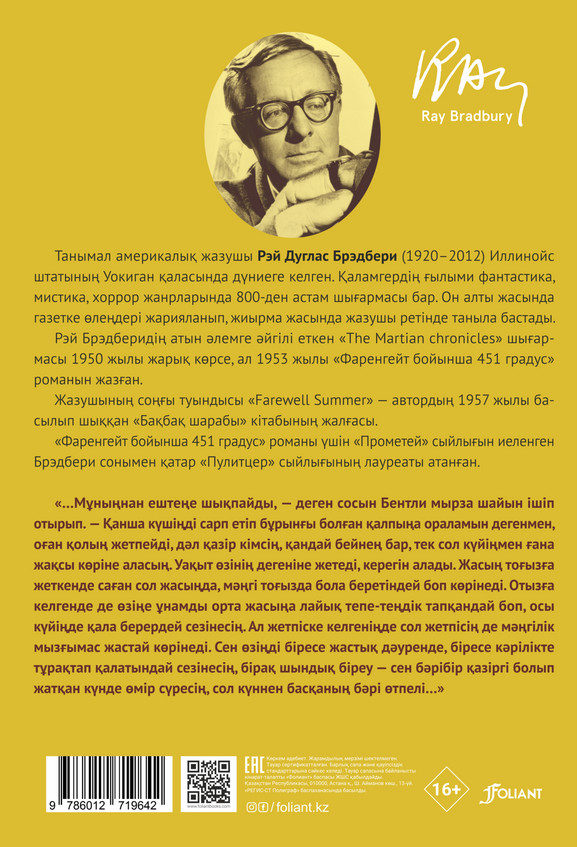 💳 Оплатить за товар можно при получении 🇰🇿 Есть бесплатная доставка по Казахстану от 1 дня 🎁 Копите бонусы с каждой покупки Серия: Әлемдік классика Әлемге әйгілі Рэй Брэдберидің «Бақбақ шарабы» атты романы он екі жасар Дуглас деген бала туралы. Кітап көңілі кіршіксіз таза, күйбең тіршіліктің уайымынан алыс балақайдың естеліктеріне толы. Дуглас үшін жаз — тұтас өмір, ал жаңа теннис туфлиі, қалашықтағы тұрғындардың хикаясы, бәрінің үрейін туғызған құбыжық және ең бастысы, жыл сайынғы отбасылық дәстүр — бақбақ шарабын әзірлеу — сол үш айлық өмірдің қызығы. Жазушы бұл романға отбасы, достық, адалдық, балалық шақ, адам өміріндегі әртүрлі кезеңнің өз қиыншылығы сияқты тақырыптарды арқау еткен. |