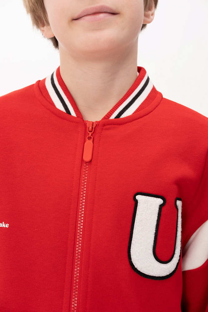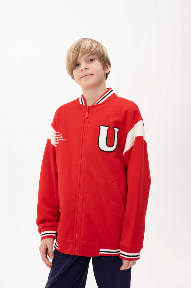 Детский бомбер на центральной застежке молнии, со спущенным плечом и углубленной проймой. Воротник, манжеты по рукавам и низу изделия — из декоративного полосатого риба — стильная резинка в университетском стиле. На рукавах вставки из основного материала контрастного цвета. Боковые карманы с листочками расположены на переде под наклоном. Детский жакет для мальчика украшен модным университетским шрифтом с засечками. Перед декорирован нашивкой — объемной мягкой аппликацией из бербер-флиса (барашек) и графичной шрифтовой композицией. Меховая нашивка буквой «U»: unity — перевод «единство, командная сплоченность». Надпись: «Be present, listen to music, be with you BF, do things that make you happy #enjoy!» — перевод «Живи в моменте, слушай музыку, встречайся со своим лучшим другом, делай то, что делает тебя счастливым #наслаждайся!». На спине круговая шрифтовая композиция: «Feeling good always trendy» — перевод «Хорошее настроение всегда в тренде (модно)».