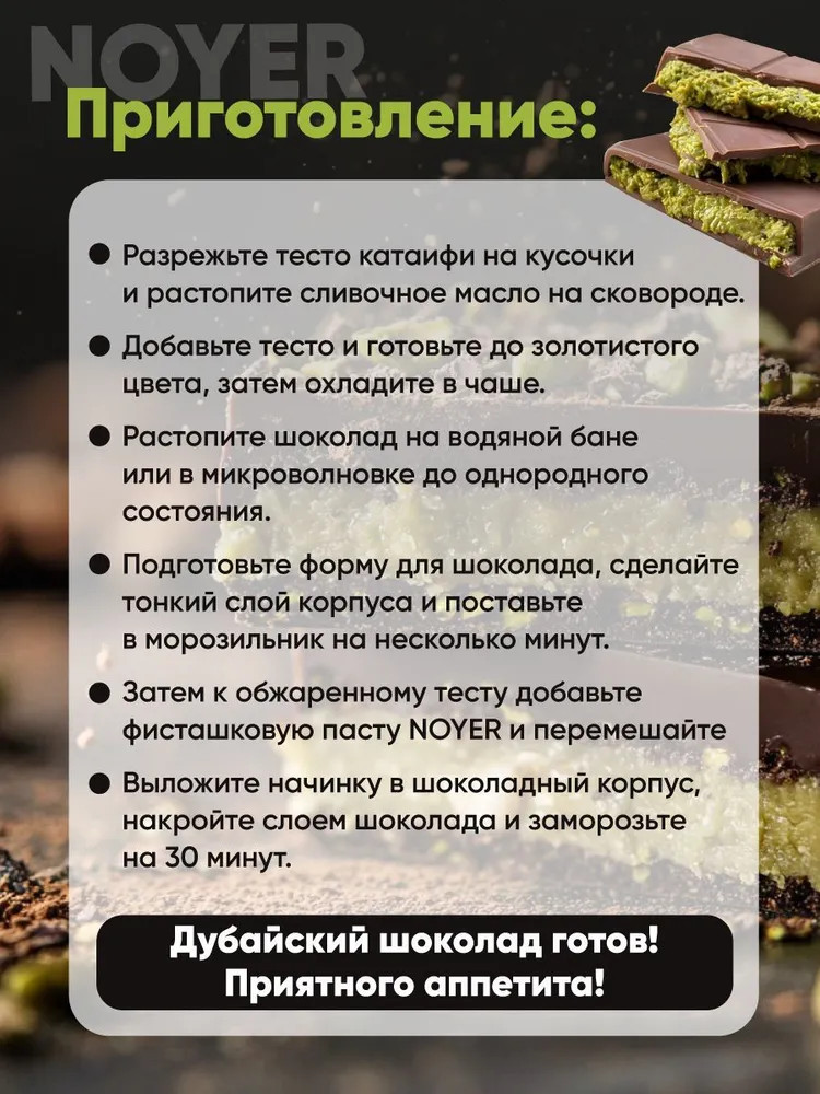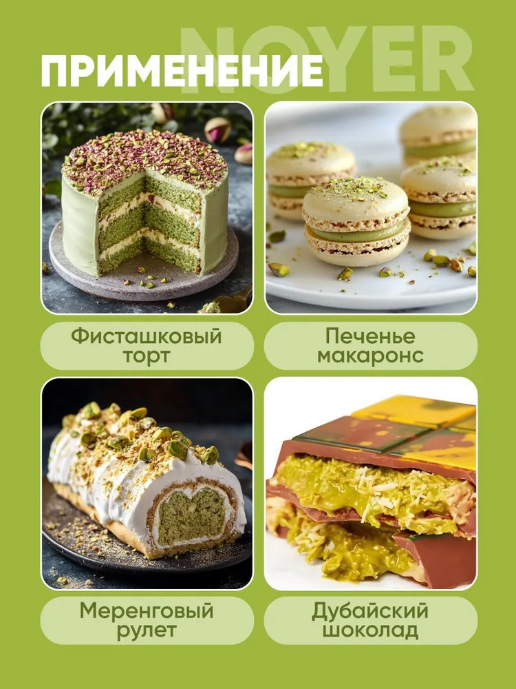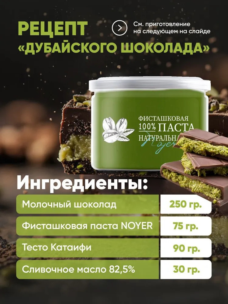 Фисташковая паста — это вкусное и питательное лакомство, которое станет отличным выбором для приготовления десертов и других сладостей. Эта ореховая паста без сахара идеально подходит для здорового питания и веганских рецептов. Мягкая и ароматная, она раскрывает насыщенный фисташковый вкус в каждом кусочке вашей еды. Одним из самых популярных способов применения пасты является приготовление дубайского шоколада. Смешайте фисташковую пасту с качественным шоколадом, чтобы получить уникальный вкус и текстуру, которые перенесут вас в атмосферу восточного изобилия. Это идеальный вариант для тех, кто хочет порадовать себя и своих гостей изысканными десертами без сахара. Используйте фисташковую пасту как крем для тортов или в качестве начинки. Она придаст особую изюминку, создавая неповторимый вкусовой ансамбль. Кондитеры оценят её универсальность: паста выгодно подчеркивает сладость кондитерских изделий и превращает любой завтрак в гурманский момент.