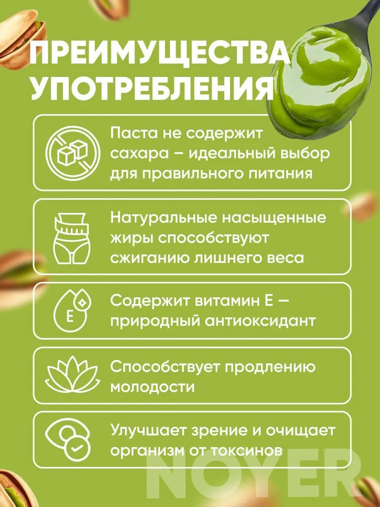 Для тех, кто заботится о здоровье, мы предлагаем продукт с чистым ореховым вкусом и составом, который сохраняется благодаря отсутствию сахара. Это отличный выбор для фитнес-меню или диетической пекарни. Фисташковая паста может использоваться не только в качестве перекуса без сахара, но и как компонент для низкокалорийной выпечки. С приятной кремовой текстурой и насыщенным фисташковым вкусом, фисташковая паста станет отличным дополнением к вашему завтраку или десерту. Она изготовлена из натуральных ингредиентов высокого качества, не содержит вредных добавок и идеально подходит для людей, ведущих здоровый образ жизни. Паста прекрасно сочетается с кофе, шоколадом и другими сладостями, а также может быть использована как самостоятельный десерт. Фисташковая паста Noyer поставляется в удобной упаковке, которая сохраняет её свежесть и ароматность. Каждая ложка — это источник энергии и здоровья, который идеально вписывается в ваш веганский или вегетарианский рацион.
