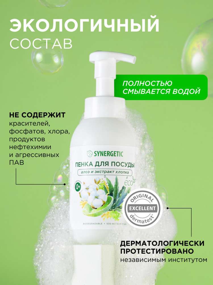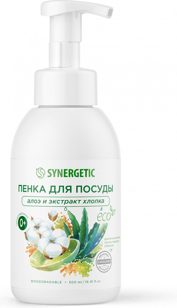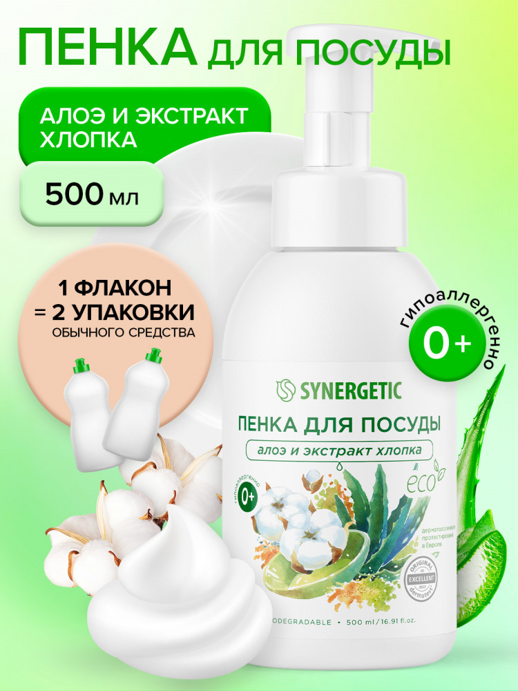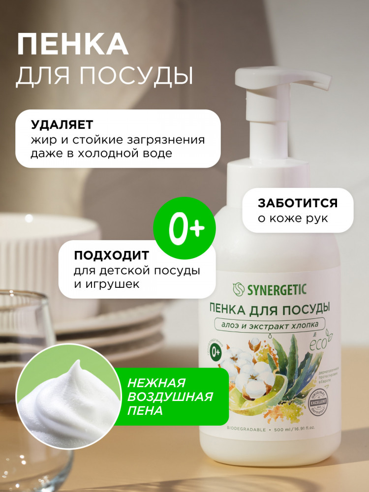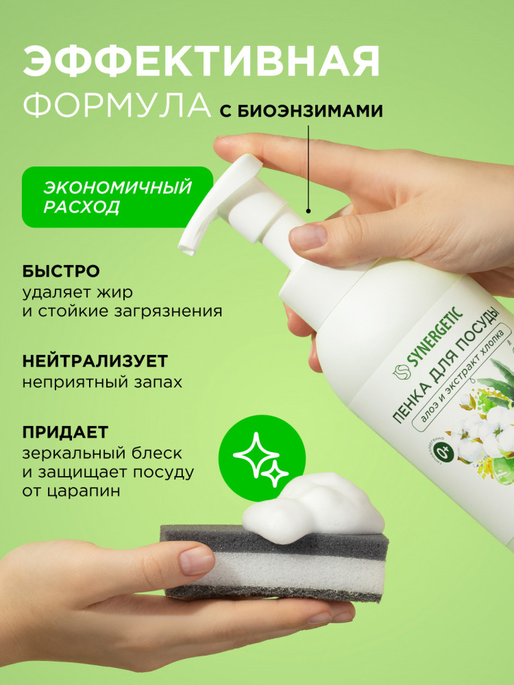 Synergetic Пенка для мытья посуды, детской посуды и игрушек «Алоэ и экстракт хлопка»
