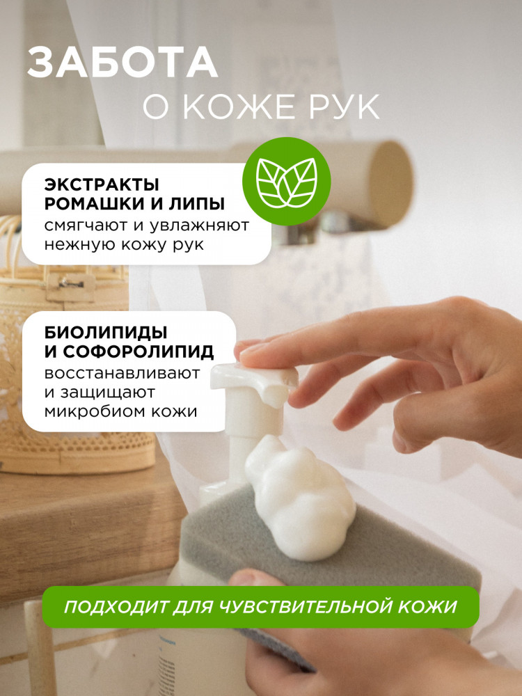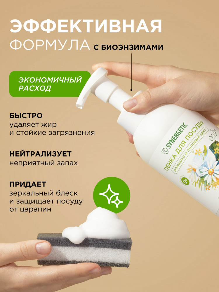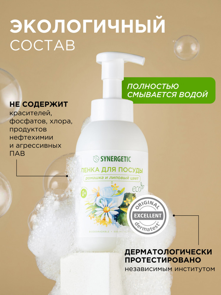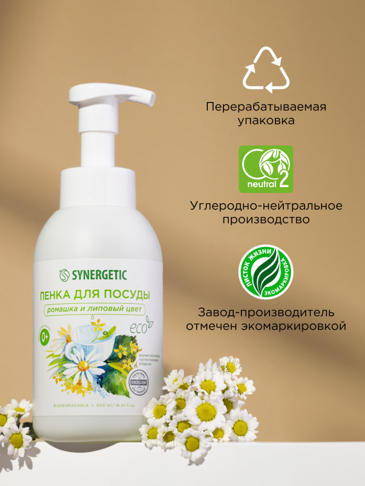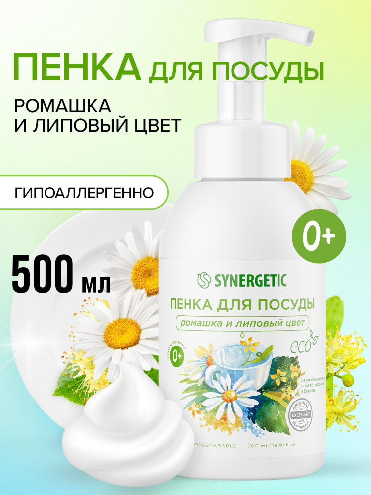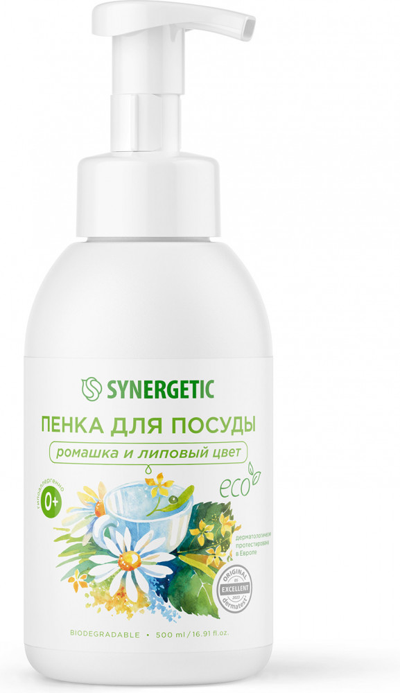 Биоразлагаемая гипоаллергенная пенка для мытья посуды, детской посуды и игрушек Synergetic «Ромашка и липовый цвет» — это эффективное средство для мытья всех видов посуды (в том числе детской), кухонного инвентаря и детских игрушек. Эффективная воздушная пена с комплексом биоразлагаемых ПАВ из растительного масла и энзимов обеспечивает быстрое удаление жира и сложных загрязнений даже в холодной воде, тщательно очищая посуду и придавая ей зеркальный блеск. Нейтрализует неприятные запахи. Экстракты ромашки и липы заботятся о нежной коже, обеспечивая интенсивное смягчение и увлажнение. Биолипиды и софоролипид растительного происхождения заботятся о естественном микробиоме, поддерживают барьерные и регенерирующие функции кожи. Биоразлагаемая пенка для посуды не содержит красителей, фосфатов, хлора, продуктов нефтехимии и агрессивных ПАВ. Безопасна при частом использовании, подходит для чувствительной кожи. Дерматологически протестирована независимым исследовательским институтом Dermatest