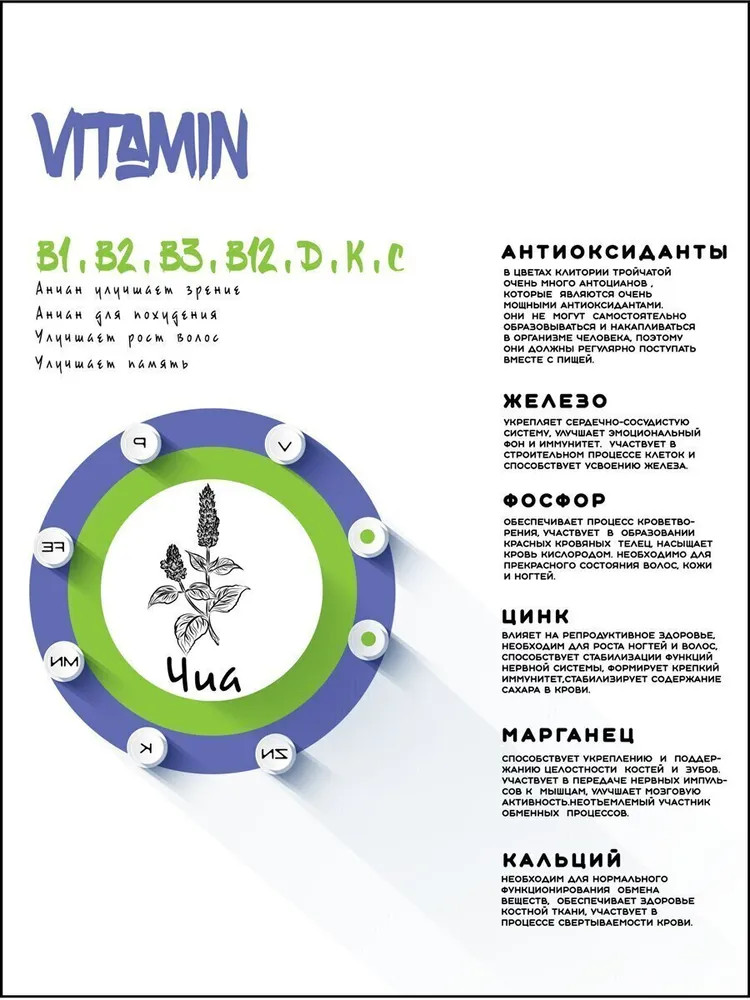 Семена чиа считаются одним из самых полезных суперфудов. Семена чиа богаты белками, необходимыми для организма жирными кислотами Омега 3, антиоксидантами, витаминами В1,В2, В3, К, РР и А, минералами. улучшают пищеварение, способствуют снижению холестерина, выводят шлаки и токсины, укрепляют иммунитет. Перед употреблением чиа рекомендуется предварительно замочить в воде или молоке на 20-30 минут. Добавляйте чиа в каши, йогурты, коктейли, соки, шейки, салаты и десерты.