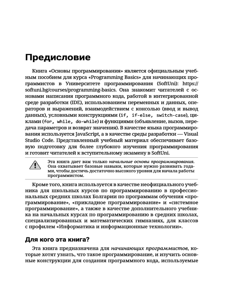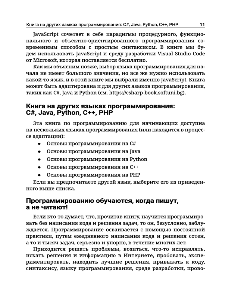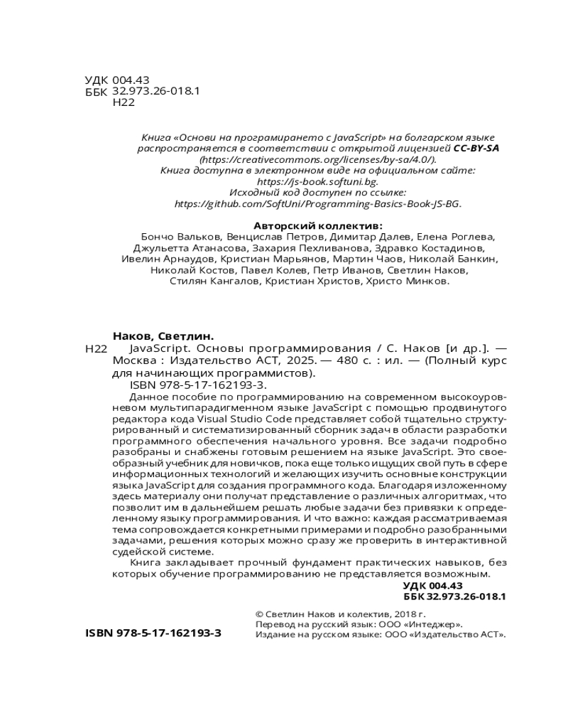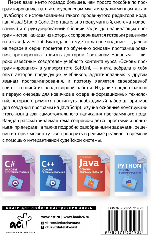 💳 Оплатить за товар можно при получении 🇰🇿 Есть бесплатная доставка по Казахстану от 1 дня 🎁 Копите бонусы с каждой покупки Серия: Полный курс для начинающих программистов Перед вами нечто гораздо большее, чем просто пособие по программированию на высокоуровневом мультипарадигменном языке JavaScript с использованием такого продвинутого редактора кода, как Visual Studio Code. Это тщательно продуманный, систематизированный и структурированный сборник задач для начинающих программистов, каждая из которых сопровождается готовым решением на языке JavaSсript. Благодаря тому, что данное издание — далеко не первое в серии проектов по обучению основам программирования, претворенных в жизнь доктором Светлином Наковым — широко известным создателем учебного контента курса «Основы программирования» в университете SoftUni, — книга вобрала в себя опыт авторов предыдущих учебников, адаптированных к другим языкам программирования, и поэтому является своеобразной квинтэссенцией их плодотворной работы. |