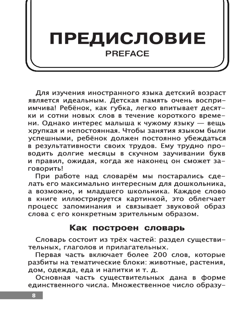 💳 Оплатить за товар можно при получении 🇰🇿 Есть бесплатная доставка по Казахстану от 1 дня 🎁 Копите бонусы с каждой покупки Серия: Легко выучить, легко запомнить С чего начать знакомство с иностранным языком? Таким вопросом задаются многие заботливые родители. На помощь им приходит «Англо-русский словарик в картинках», с которым дошколята легко запомнят более 500 английских слов и базовые правила английской грамматики. Читая иллюстрированный словарь вместе со взрослыми, пробуя произносить английские слова и составлять простые предложения, малыш поймёт, что учиться — это весело и увлекательно. Наш визуальный словарик построен по тематическому принципу: можно изучать слова не отдельно, а группами — так у ребёнка зарождается интерес к языку, появляется мотивация к его освоению. Для каждого слова на английском — транскрипция + перевод + иллюстрация, это помогает сформировать ассоциации, тренирует зрительную память, обогащает словарный запас, развивает начальные навыки самостоятельного чтения на английском языке. Для дошкольного и младшего школьного возраста. |