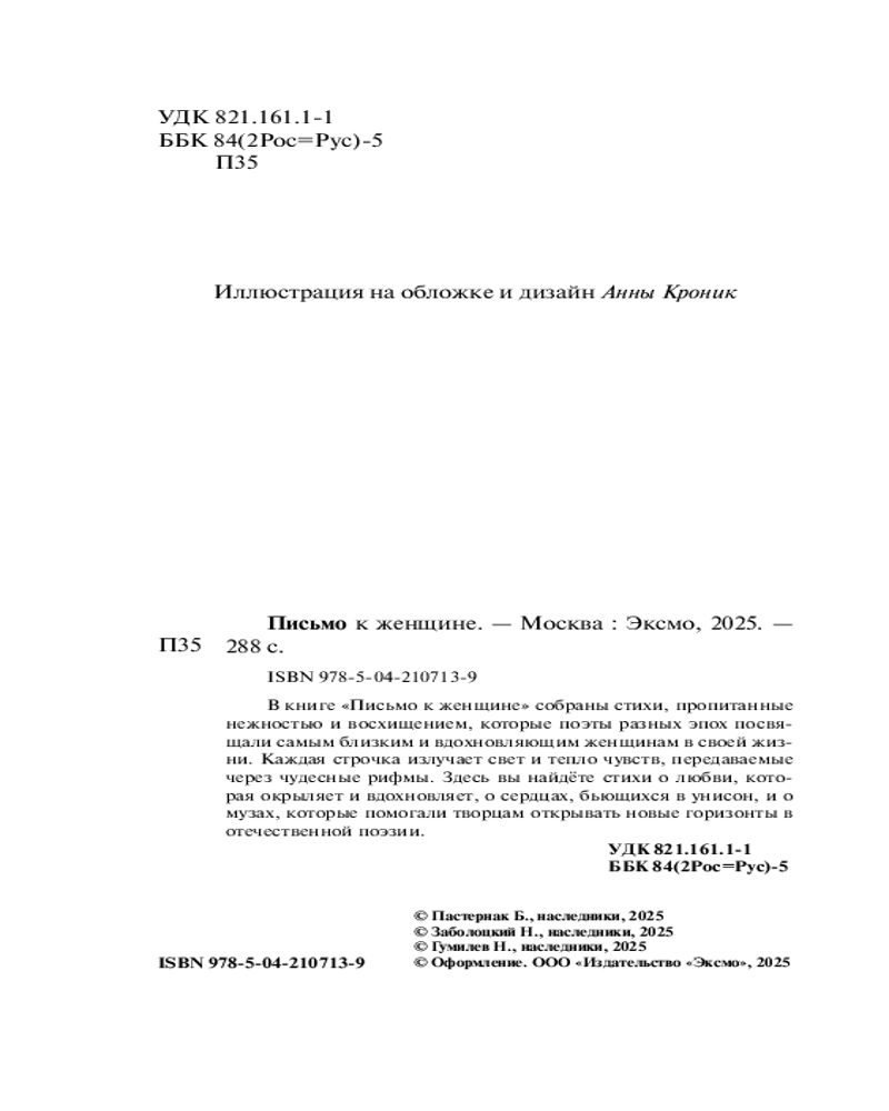 💳 Оплатить за товар можно при получении 🇰🇿 Есть бесплатная доставка по Казахстану от 1 дня 🎁 Копите бонусы с каждой покупки Серия: Яркие страницы. Коллекционные издания В книге «Письмо к женщине» собраны стихи, пропитанные нежностью и восхищением, которые поэты разных эпох посвящали самым близким и вдохновляющим женщинам в своей жизни. Каждая строчка излучает свет и тепло чувств, передаваемые через чудесные рифмы. Здесь вы найдёте стихи о любви, которая окрыляет и вдохновляет, о сердцах, бьющихся в унисон, и о музах, которые помогали творцам открывать новые горизонты в отечественной поэзии. |