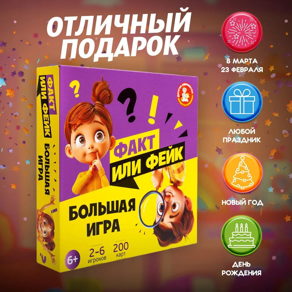 💳 Оплатить за товар можно при получении 🇰🇿 Есть бесплатная доставка по Казахстану от 1 дня 🎁 Копите бонусы с каждой покупки Настольная игра для большой компании «Факт или фейк? Большая игра» — это настоящая интеллектуальная битва! Придется поломать голову над простыми на первый взгляд вопросами! А победит самый эрудированный! Это игра на внимательность, повышение эрудиции и развитие интеллекта. С помощью весёлой детской настольной игры правда или ложь вы проверите уровень своих знаний и интересно проведете время в компании. |