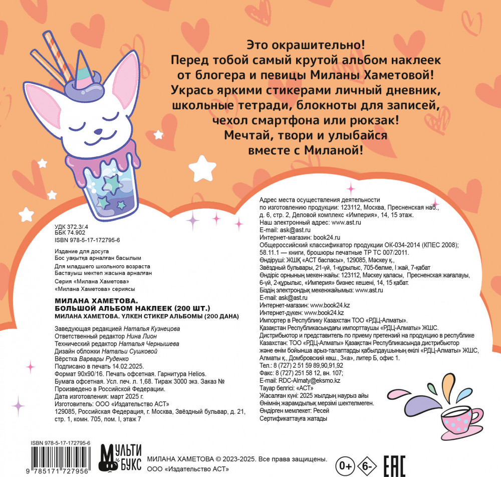 💳 Оплатить за товар можно при получении 🇰🇿 Есть бесплатная доставка по Казахстану от 1 дня 🎁 Копите бонусы с каждой покупки Серия: Милана Хаметова Это окрашительно! Перед тобой самый крутой альбом наклеек от блогера и певицы Миланы Хаметовой! |