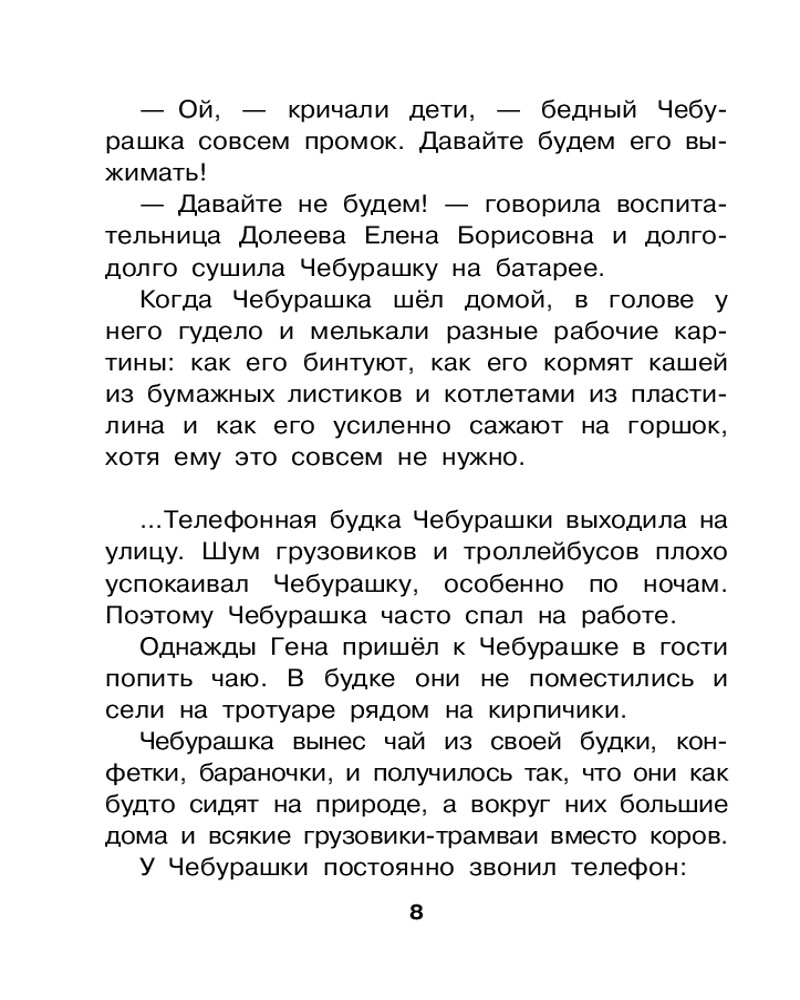 💳 Оплатить за товар можно при получении 🇰🇿 Есть бесплатная доставка по Казахстану от 1 дня 🎁 Копите бонусы с каждой покупки Серия: Лучшая детская книга Крокодил Гена и Чебурашка — знаменитые герои произведений детского писателя Эдуарда Успенского. В сказке «Похищение Чебурашки» авантюрные приключения двух друзей становятся ещё более захватывающими и опасными. На этот раз жизнь Чебурашки кардинально меняется, когда из тесной телефонной будки он переезжает в просторную квартиру и получает в подарок целых пять телевизоров! А вот к чему приведёт Чебурашку бесконечный просмотр телепередач — читатель узнает из этой книги. Яркие иллюстрации нарисовали Сергей Бордюг и Наталия Трепенок. Для младшего школьного возраста. |