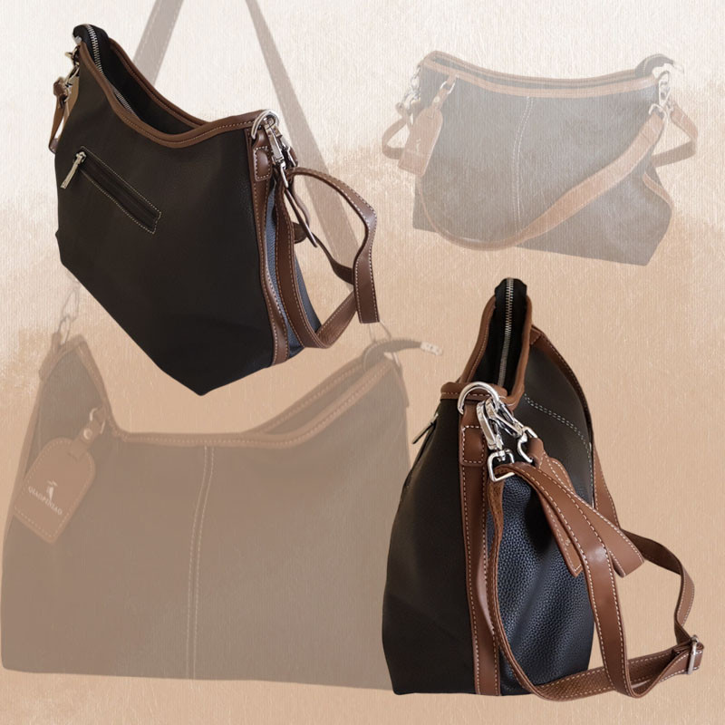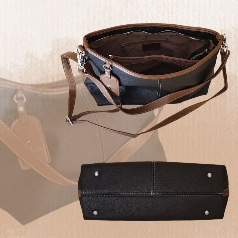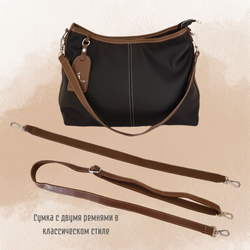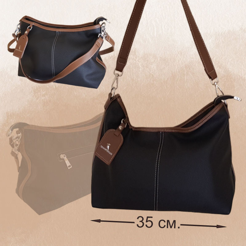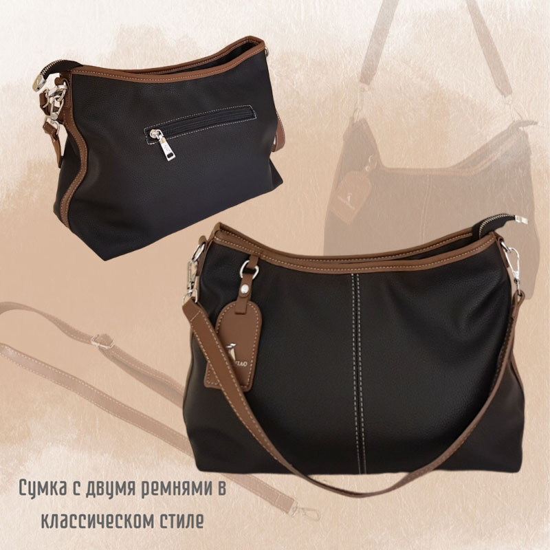 Стильная сумка отличного качества черного цвета. Крепко сшита, надежные замки, ровные строчки, добротная фурнитура. Сумку украшает отделка из коричневой окантовки из экокожи и навесная декоративная подвеска. Сумка застегивается на молнию и имеет три отделения, один из которых тоже застегивается на замок. Имеются также внутренний карман на молнии и карман без застежки. Сзади сумки предусмотрен карман на молнии. В комплектацию входят два отстегивающихся плечевых ремня: один, более короткий позволяет носить сумку на плече, другой легко регулируется по длине и его можно носить как на плече, так и через плечо. Такая сумка прослужит долгие годы! Для тех, кто любит вещи, привлекающие внимание и, в то же время, хочет выглядеть не вычурно и со вкусом. Сумка подойдет практически к любому наряду, а черный цвет — это безусловный фаворит в любом гардеробе!