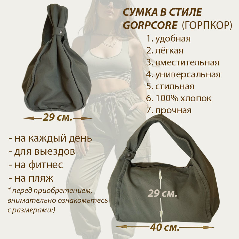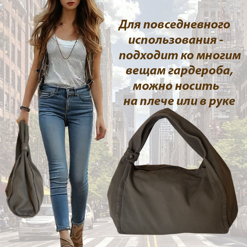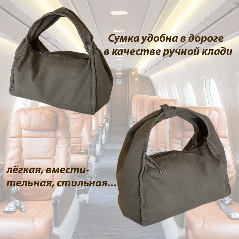 Текстильная сумка из натуральных хлопково-холщовых волокон цвета хаки, станет прекрасным дополнением к вашему гардеробу, особенно в весенне-летний период. Она буквально создана для тех, кто любит свободу передвижения. Очень вместительная, но при этом легкая — такая сумка не только удобна для повседневной носки, но её можно взять с собой в путешествие в качестве ручной клади. Не громоздкая, но вместительная — сумка может подойти вам для фитнеса, бани, бассейна и её можно даже взять с собой на пляж. Такой аксессуар непременно привлечет внимание окружающих, подчеркивая ваш безупречный вкус. Особенно, если Вы предпочитаете стиль «горпкор» или стиль «хобо». Сумка аккуратно сшита и имеет качественную фурнитуру. К сумке предусмотрено отстегивающее текстильное кольцо, которое вы можете пристегнуть к ручке сумки в качестве декоративного элемента.