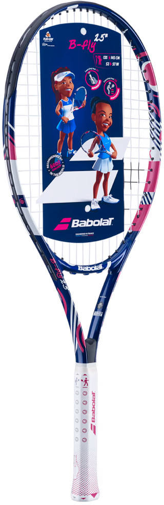 Babolat B`Fly 25 — ракетка для детей 9-10 лет, рост от 135 до 145 см, прекрасно подходит для тренировок. Прочная алюминиевая конструкция с большим рабочим ресурсом предназначена для маневренной игры. Красочный дизайн. Ракетка Babolat B`Fly 25 имеет разметки разных цветов на грипе (improver grip) для постановки правильной техники игры.