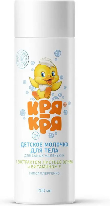 Кря-Кря Молочко для тела детское с экстрактом листьев оливы и витамином ЕВ данный момент этот товар отсутствует в продаже. Возможно, у нас найдется аналогичный или похожий товар здесь. Молочко для тела «Кря-Кря» обеспечивает нежный и бережный уход за кожей ребенка. Молочко быстро впитывается, поддерживает защитный барьер кожи. Натуральные компоненты, входящие в состав, смягчают и увлажняют кожу малыша. |