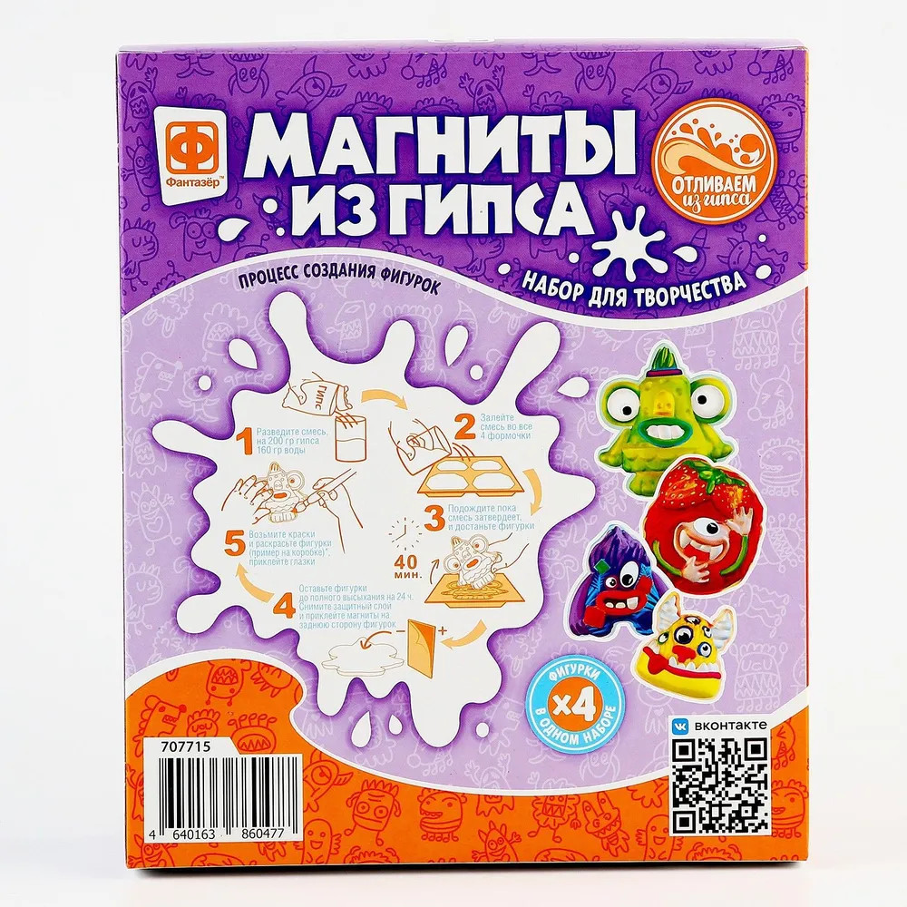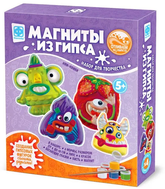 Детский набор магниты из гипса «Монстрики Нямнямки» позволит ребёнку создать красивое украшение интерьера или оригинальный подарок родным и друзьям. Процесс создания магнита прост и занимателен: достаточно смешать гипс с водой и залить в формочки. После полного высыхания магнитов ребёнок может расписать их красками. Работа с набором развивает творческие способности, воображение, внимание, мелкую моторику и усидчивость.