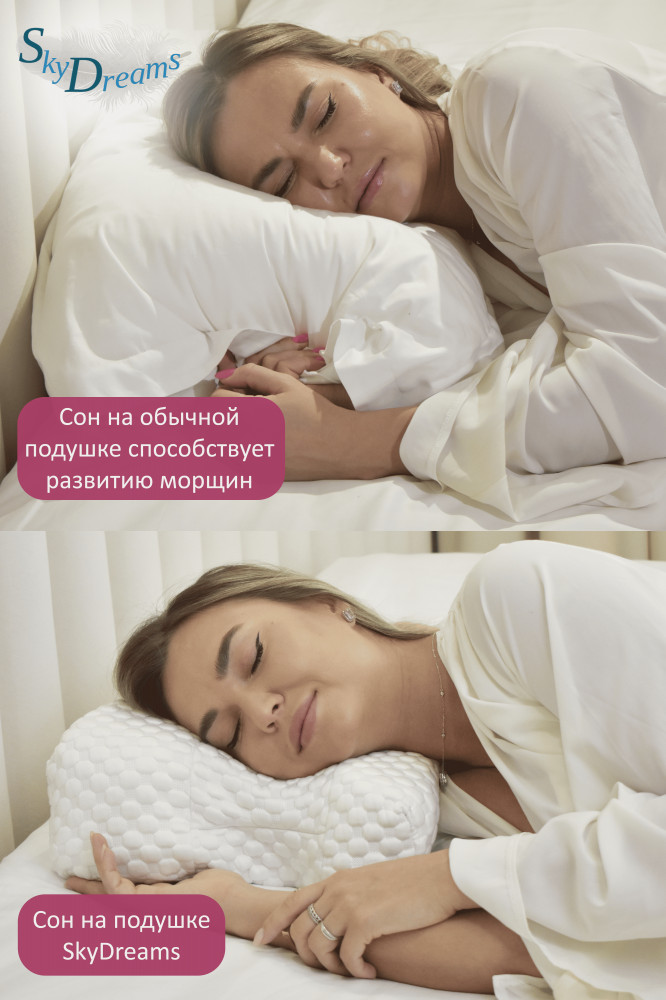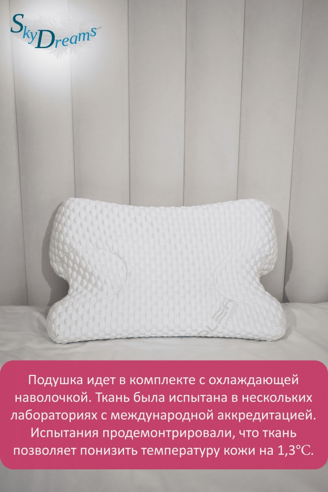 Ортопедическая подушка SkyDreams против морщин с эффектом памяти и охлаждающей наволочкой – комфортный сон с косметическим эффектом. Подушка SkyDreams выполнена из специальной пены с эффектом памяти, тем самым учитывает все индивидуальные особенности человека, а также заботится о Вашей коже во время сна, предупреждая развитие и формирование новых морщин. Для этого по краям подушки есть выемки для лица, благодаря которым подушка не оказывает давления на кожу и препятствует появлению отеков и заломов на лице после сна.