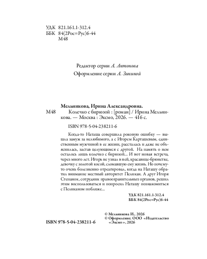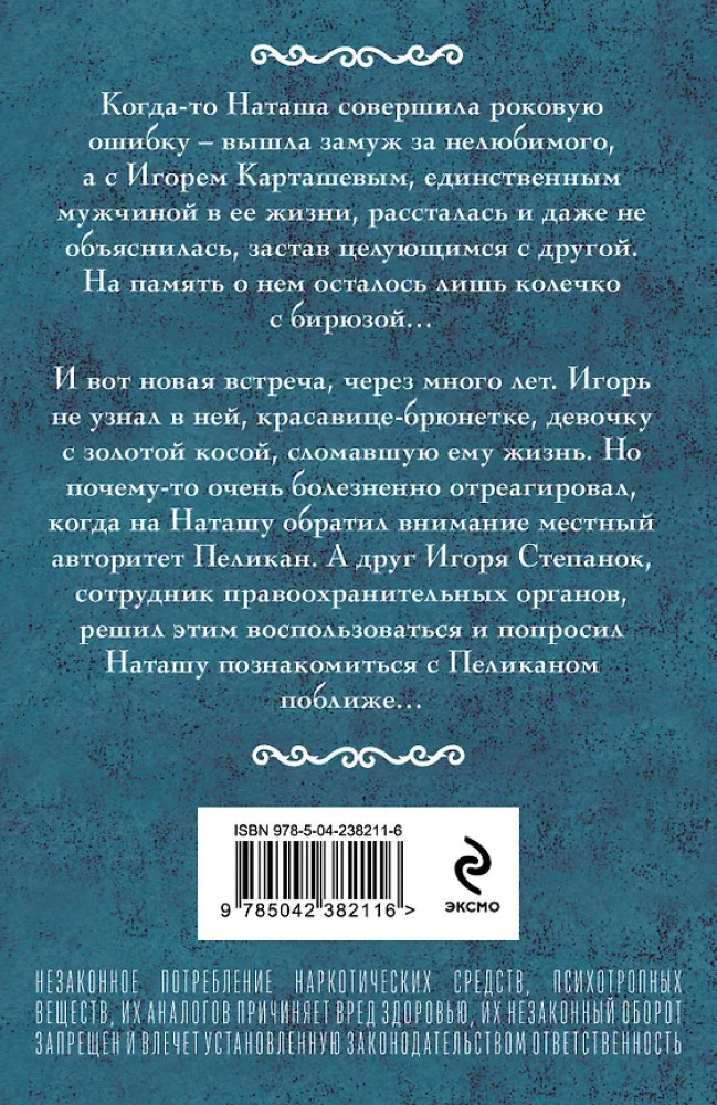 💳 Оплатить за товар можно при получении 🇰🇿 Есть бесплатная доставка по Казахстану от 1 дня 🎁 Копите бонусы с каждой покупки Серия: Любовь, интрига, тайна. Новое оформление (обложка) Когда-то Наташа совершила роковую ошибку — вышла замуж за нелюбимого, а с Игорем Карташевым, единственным мужчиной в ее жизни, рассталась и даже не объяснилась, застав целующимся с другой. На память о нем осталось лишь колечко с бирюзой... И вот новая встреча, через много лет. Игорь не узнал в ней, красавице-брюнетке, девочку с золотой косой, сломавшую ему жизнь. Но почему-то очень болезненно отреагировал, когда на Наташу обратил внимание местный авторитет Пеликан. А друг Игоря Степанок, сотрудник правоохранительных органов, решил этим воспользоваться и попросил Наташу познакомиться с Пеликаном поближе... |