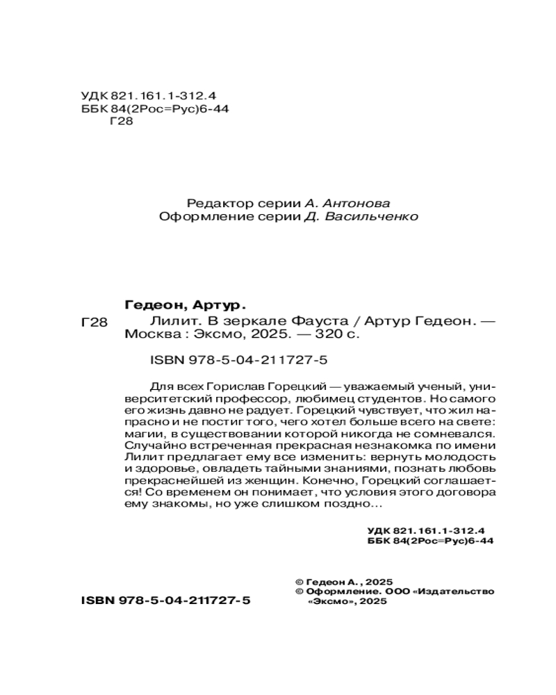 💳 Оплатить за товар можно при получении 🇰🇿 Есть бесплатная доставка по Казахстану от 1 дня 🎁 Копите бонусы с каждой покупки Серия: Черные лебеди. Мистические триллеры Для всех Горислав Горецкий — уважаемый ученый, университетский профессор, любимец студентов. Но самого его жизнь давно не радует. Горецкий чувствует, что жил напрасно и не постиг того, чего хотел больше всего на свете: магии, в существовании которой никогда не сомневался. Случайно встреченная прекрасная незнакомка по имени Лилит предлагает ему все изменить: вернуть молодость и здоровье, овладеть тайными знаниями, познать любовь прекраснейшей из женщин. Конечно, Горецкий соглашается! Со временем он понимает, что условия этого договора ему знакомы, но уже слишком поздно... |