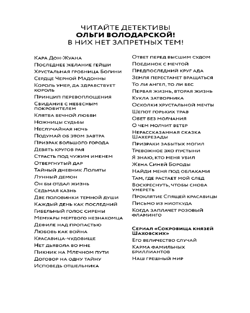 | Ольга Володарская — известный писатель, автор более чем пятидесяти книг в жанре остросюжетного романа. Детективы Ольги Володарской сочетают остроту современной прозы и напряженность психологического триллера. |