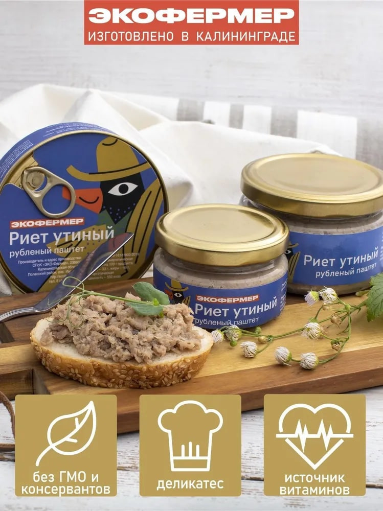 Экофермер Риет утиныйВ данный момент этот товар отсутствует в продаже. Возможно, у нас найдется аналогичный или похожий товар здесь. Риет утиный — это разновидность паштета, который готовится из мяса посредством долгого тушения на медленном огне. Консистенция паштета в итоге получается текстурной и волокнистой, более плотной чем паштет, но в то же время нежной.Риеты представлены как в классическом варианте, так и с добавлением кусочков Фуа-гра, фруктово-ягодных компонентов — апельсина, груши, брусники!Кусочки Фуа-Гра придают продукту изысканность и великолепный вкус. Фуа-Гра — утиная печень- известна своими полезными свойствами , обладая множеством уникальных качеств высоко ценится среди гурманов во всем мире.Ягоды и фрукты оставляют незабываемое кисло-сладкое послевкусие!Это натуральный и гипоаллергенный эко-продукт, без ГМО, добавок или консервантов. Риет идеально подходит для завтраков или перекусов, для бутербродов. Этот готовый продукт отлично подойдет, чтобы взять его в поход, на рыбалку, охоту или продукт на дачу, так как не требует хранения в холодильнике. Станет хорошей альтернативой обычным мясным консервам или еды быстрого приготовления. Риет не требует при открывании консервного ножа, так как наше готовое блюдо в упаковке с удобным язычком или крышкой твист-офф. |