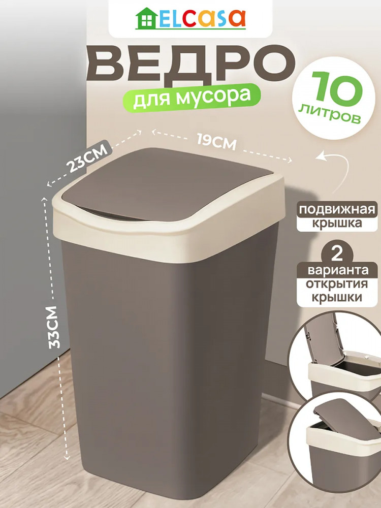 Ведро для мусора с подвижной крышкой El Casa размером 23×19×33 см и объёмом 10 литров поможет поддерживать чистоту в вашем доме, офисе или на улице. Размер дна 18.6×15 см. Мусорное ведро выполнено из полипропилена. Этот вид пластика считается наиболее безопасным, так как не содержит бисфенол А и не выделяет вредных веществ. Мусорное ведро прямоугольной формы серого цвета с чёрным ободком можно разместить в ванной комнате, туалете или на кухне. Поставьте урну из пластика на пол возле раковины, стола или в хозяйственный шкаф. Высокое пластиковое ведёрко можно использовать как офисное — под ненужные бумаги. Большая ёмкость обеспечивает достаточное пространство для хранения мусора любого вида. Можно приспособить на даче как уличную мусорку. Пластиковые мусорные вёдра выполнены в универсальном дизайне и хорошо сочетаются друг с другом. Можно использовать несколько баков из пластика для организации раздельной системы сбора мусора. Корзина для мусора с откидной крышкой станет незаменимым помощником для поддержания чистоты как в доме, так и на улице и поможет организовать порядок в любом пространстве.