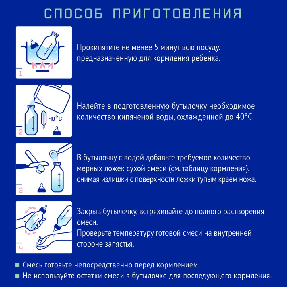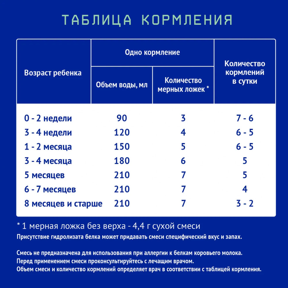 Схема кормления: (из расчета 1 мерная ложка без верха — 4,4 г сухой смеси):