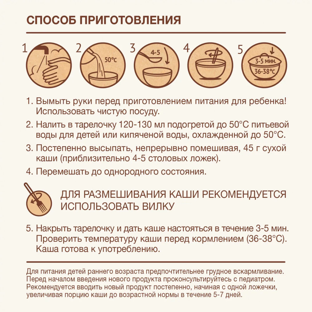 • перед введением нового продукта проконсультируйтесь с педиатром. Рекомендуется вводить прикорм постепенно, начиная с одной ложечки, увеличивая порцию каши до возрастной нормы в течение 5–7 дней.