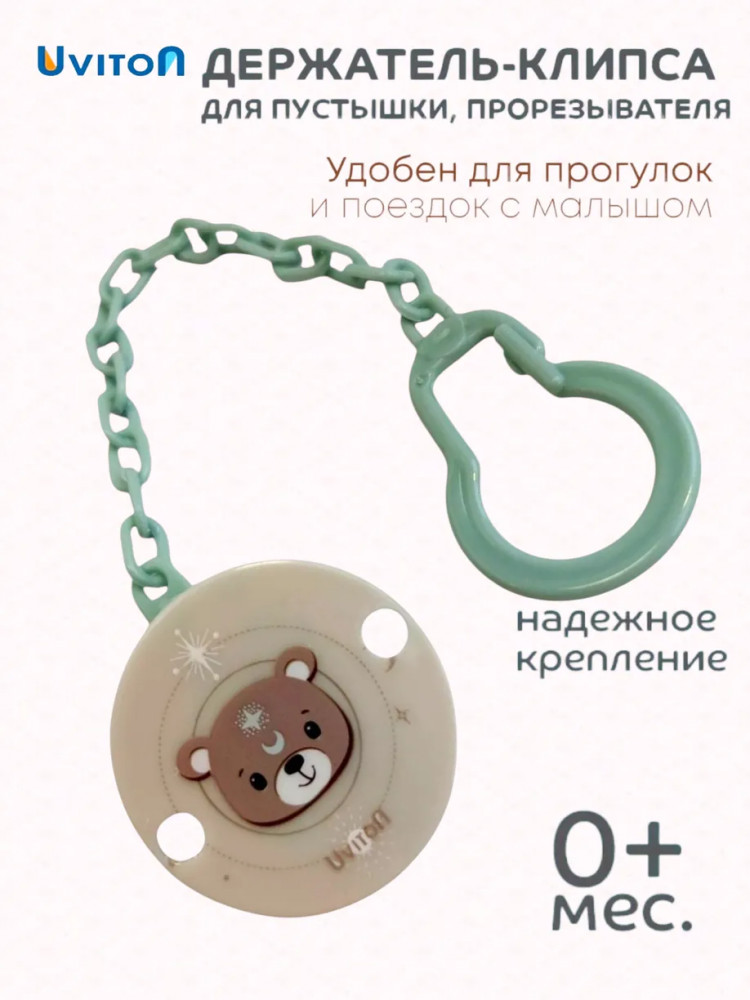 Держатель-клипса для пустышки от Uviton поможет любимой соске пустышке малыша всегда оставаться на месте. С помощью держателя для соски можно держать грызунок. С держателем соска/пустышка вашего малыша всегда будет в чистоте. Зажим-прищепка надежно крепится к одежде и не портит ее. На конце цепочки есть карабин, который зацепляется за кольцо пустышки. С ним можно играть, очаровательный дизайн точно понравится вашему малышу или малышке. Яркие цвета привлекут внимание ребенка и будут отлично смотреться на фоне детской одежды. Держатель для соски пустышки незаменим во время прогулок и путешествий. Вместе с одеждой для новорожденных детский держатель для соски прекрасно дополнит подарочный комплект на выписку в роддом, а так же это отличный подарок на выписку, подарок новорожденному.